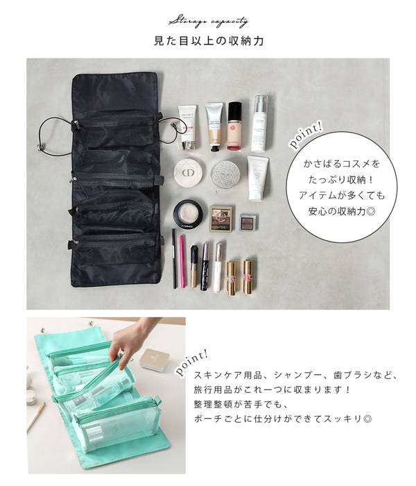 - 旅行に行く際、小物が有りますが、袋の種類が多くて,収納・、取り外しも出来るし、とても使いやすい