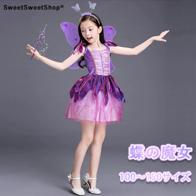 ハロウィン 衣装 子供 蝶の魔女 お姫様 紫 ショートドレス 妖精 女の子 コスプレ 仮装 コスチューム 4点セット