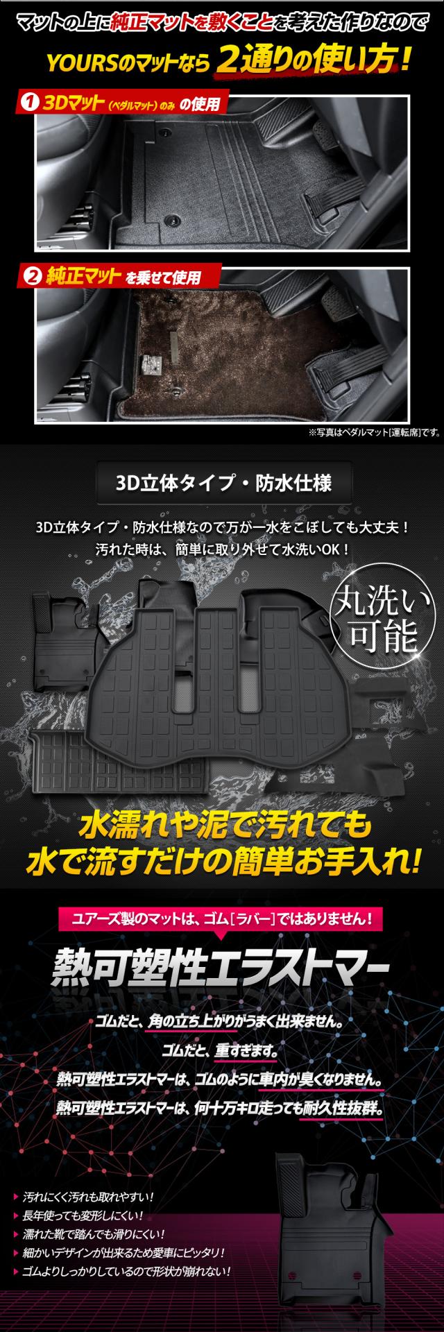 一緒に欲しかったが叶う、セット割商品です♪ どの部位のマットもフロアをスキャンして製作しているのでピッタリフィット! 車体にあった形状で、汚れや水から車内をしっかりカバーしてくれます。 車内のゴミや砂をガッチリガード!! ・隙間なくフィットするので、ゴミや砂が直接車両床に落ちることはありません。 ・3Dデザインなので縁の数センチの立ち上がりで水や汚れをしっかりキャッチ! 完全防水なのでお手入れも簡単! ・水や汚れは軽いものならウエスなどで拭くだけでOK! ・全面的に汚れた場合は丸洗いも可能なので衛生的です。 |