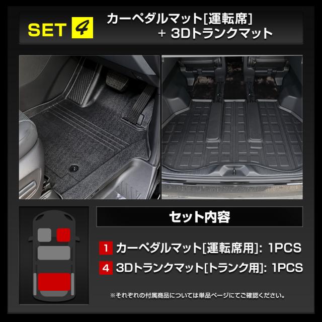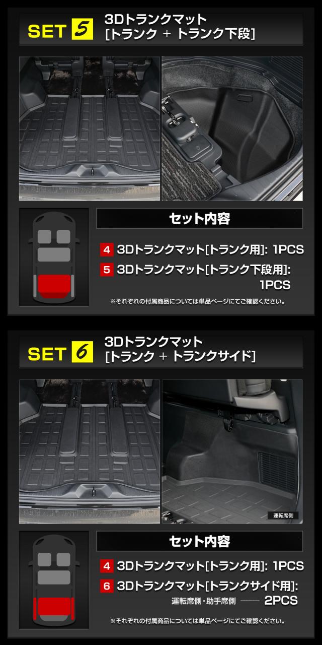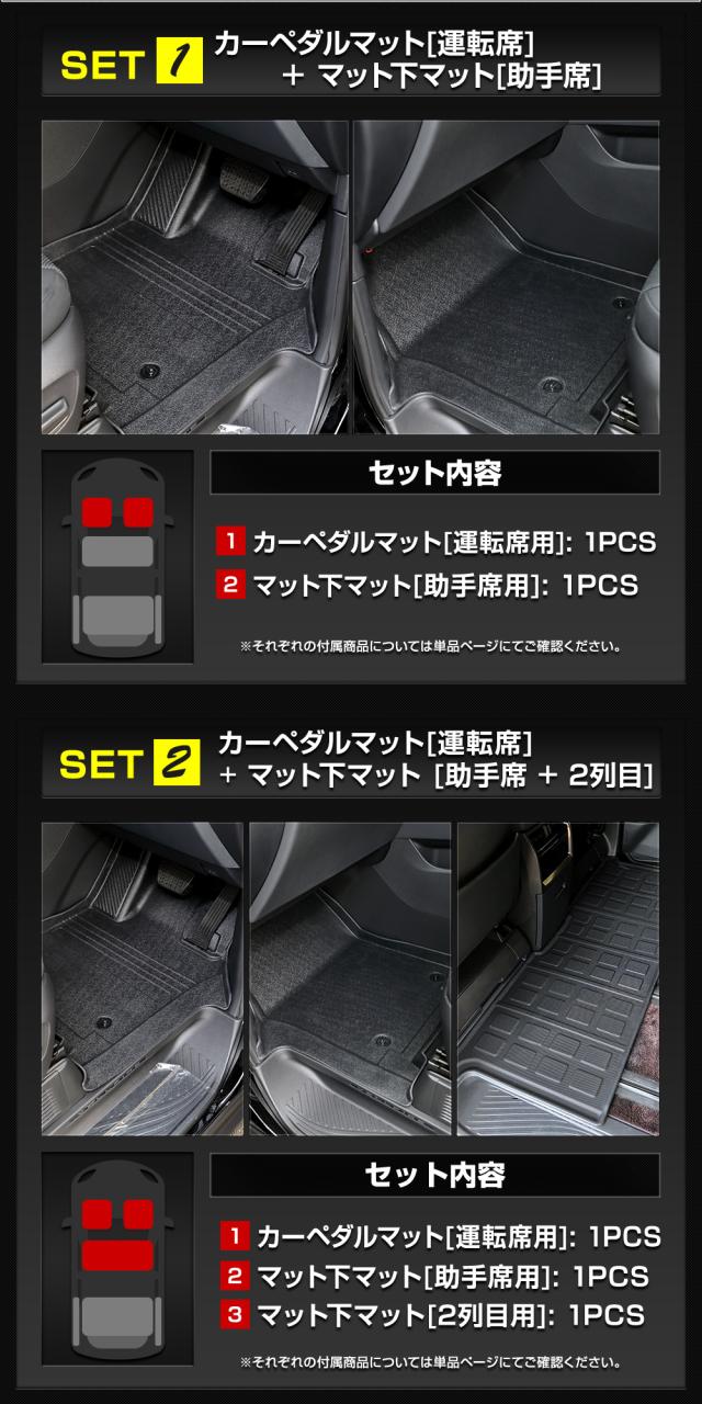 [1]カーペダルマット[運転席用] 1PCS [2]マット下マット[助手席用] 1PCS ■SET2 [1]カーペダルマット[運転席用] 1PCS [2]マット下マット[助手席用] 1PCS [3]マット下マット[2列目用]1PCS ■SET4 [1]カーペダルマット[運転席用] 1PCS [4]3Dトランクマット[トランク用]1PCS ■SET5 [4]3Dトランクマット[トランク用]1PCS [5]3Dトランクマット[トランク下段用]1PCS ■SET6 [4]3Dトランクマット[トランク用]1PCS [6]3Dトランクマット[トランクサイド用]2PCS ※各商品の付属品については単品ページからご確認ください。 |