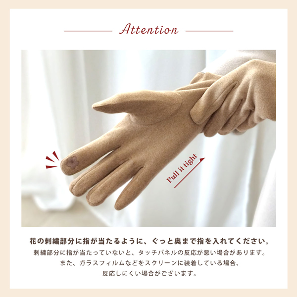※スマホ操作する際は、指をぐっと奥まで入れて先端のお花の刺繍部分に指の腹をあてながら操作してください。