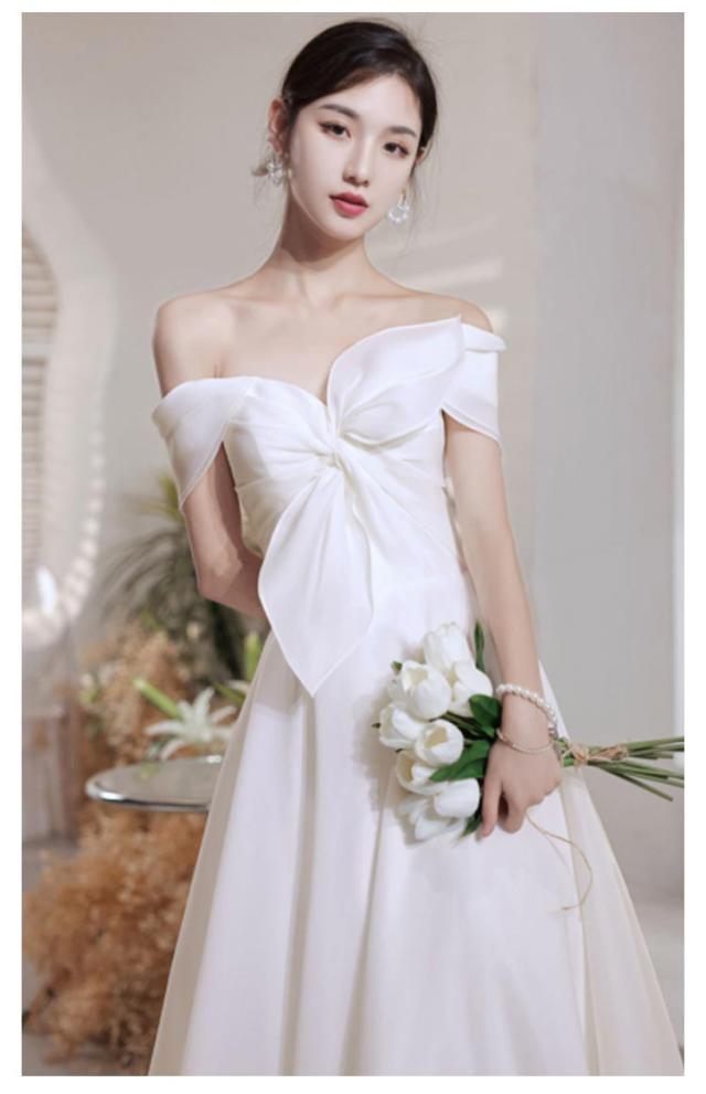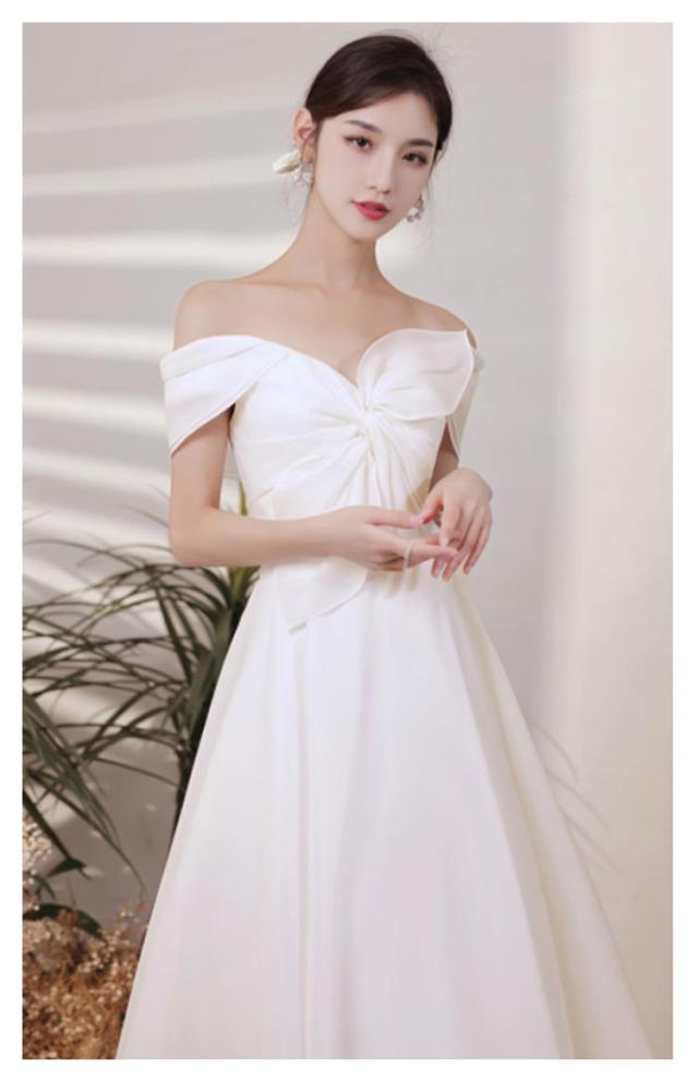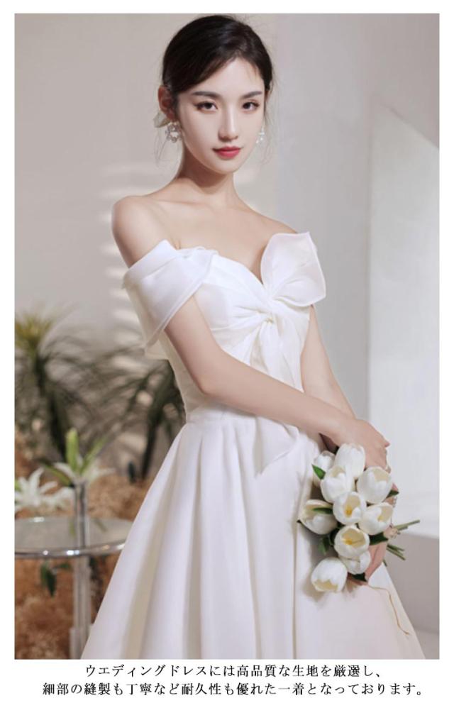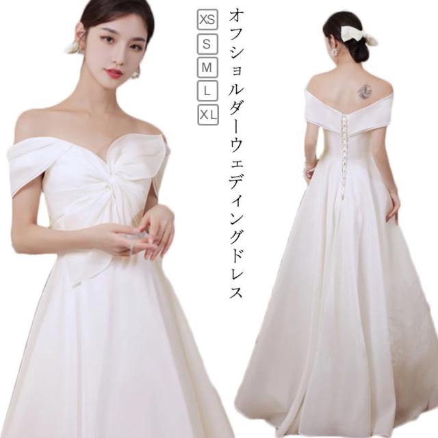 オフショルダー ウエディングドレス 二次会 Vネック エンパイアドレス エンパイアライン フォトウェディング ドレス ロング フロントリボン 編み上げタイプ ウエディングドレス