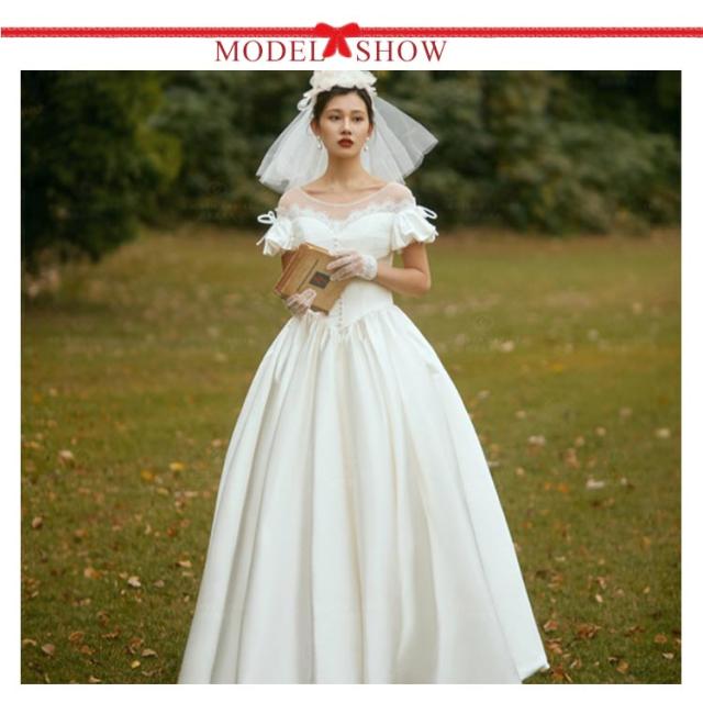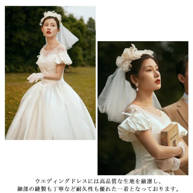 ウエディングドレス ウェディングドレス Vネック レース Aライン パフスリーブ ドレス リボン 花嫁 チューブトップ ドレス エンパイアライン 2次会 結婚式 披露宴 前撮り 二次会 ハネムーンフォト ウエディングドレス エンパイアドレス