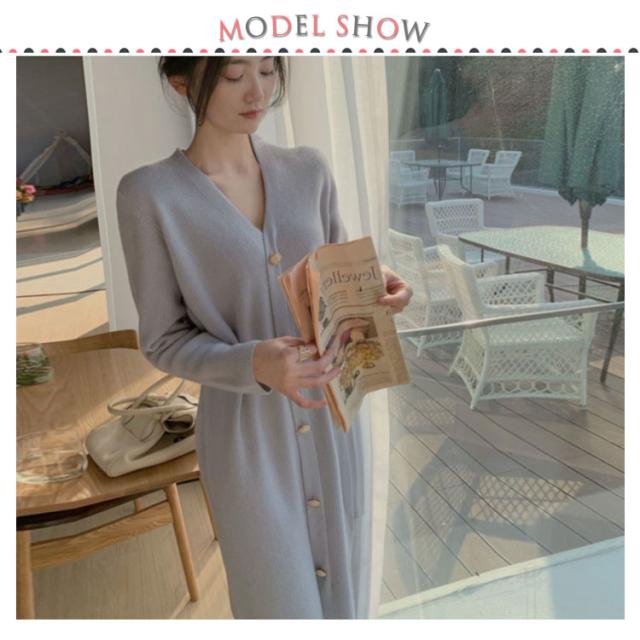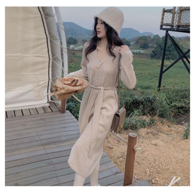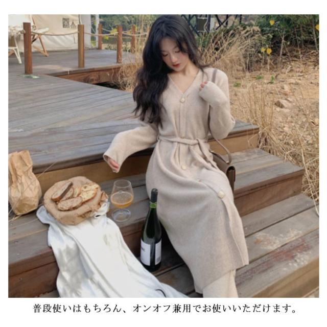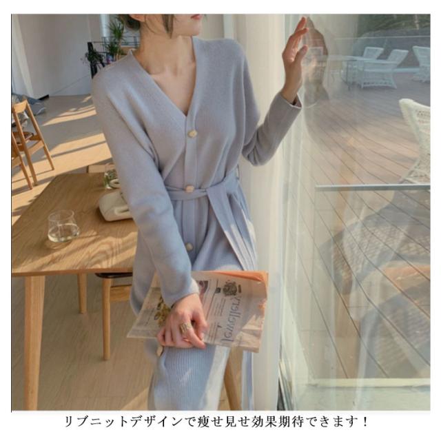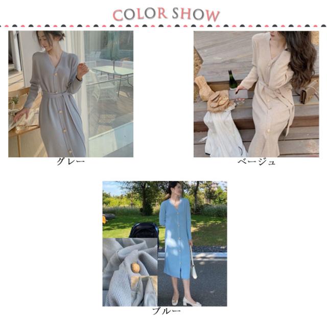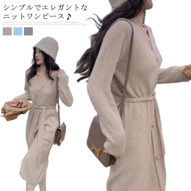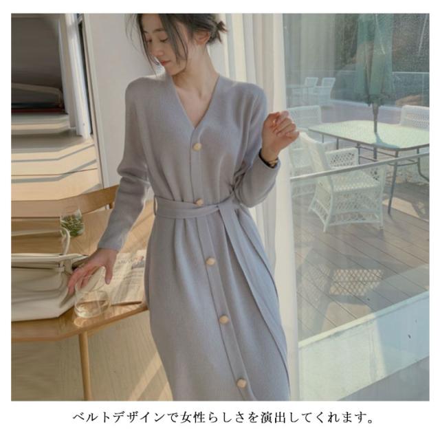 ニットワンピース Vネック ニット ワンピース ロング丈 膝下丈 ワンピ 前ボタン リブニット Aライン ウエストベルト お出かけ 通勤 着回し おしゃれ カジュアル 春 秋 冬