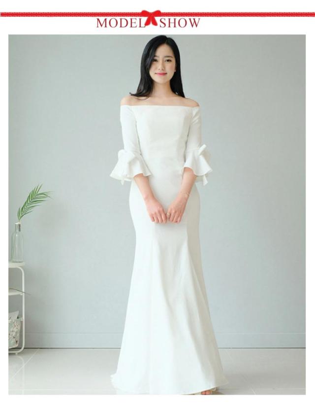 ロングドレス 白 マーメイドライン ウェディングドレス フレア袖 オフショルダー パーティードレス フィッシュテール ウェディング 袖リボン 結婚式 ワンピース 海外 挙式 ホワイト ロング丈 ウエディング