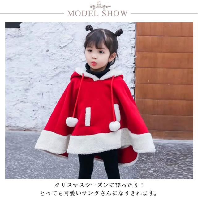 | フードがついたサンタクロース衣装風の可愛いケープが登場! クリスマスシーズンにぴったり!とっても可愛いサンタさんになりきれます。 生地は柔らかくて厚みのある素材でお子様の肌にも優しい肌触りです。 フードがトナカイの角をしていたり、お子様の可愛さをより引き立てる。 サンタマントは冷え防止だけではなく、クリスマスの雰囲気を盛り上げます。 | |