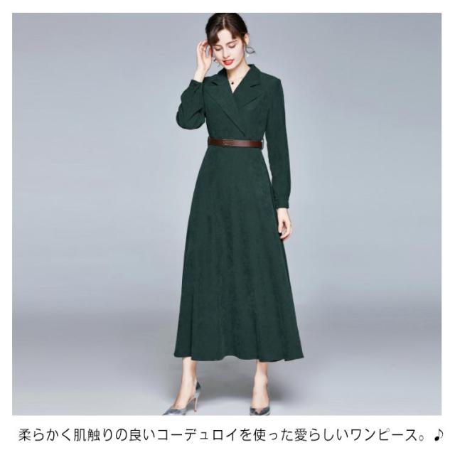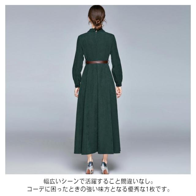 通勤 シャツワンピース コーデュロイワンピース コーデュロイ レディース Vネック ロング丈 秋冬 ビジネス 上品 おしゃれ スーツ襟 ベルト付き