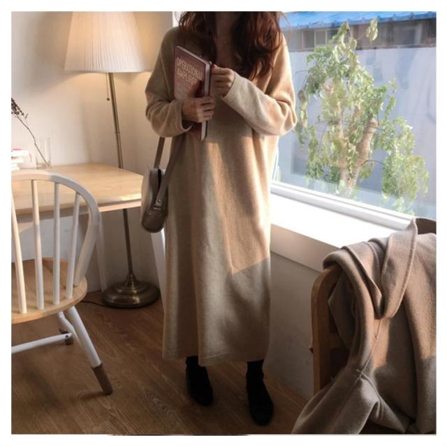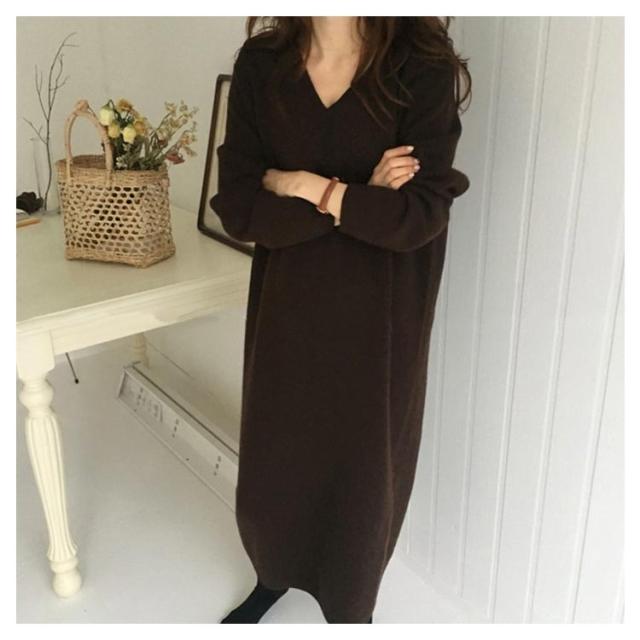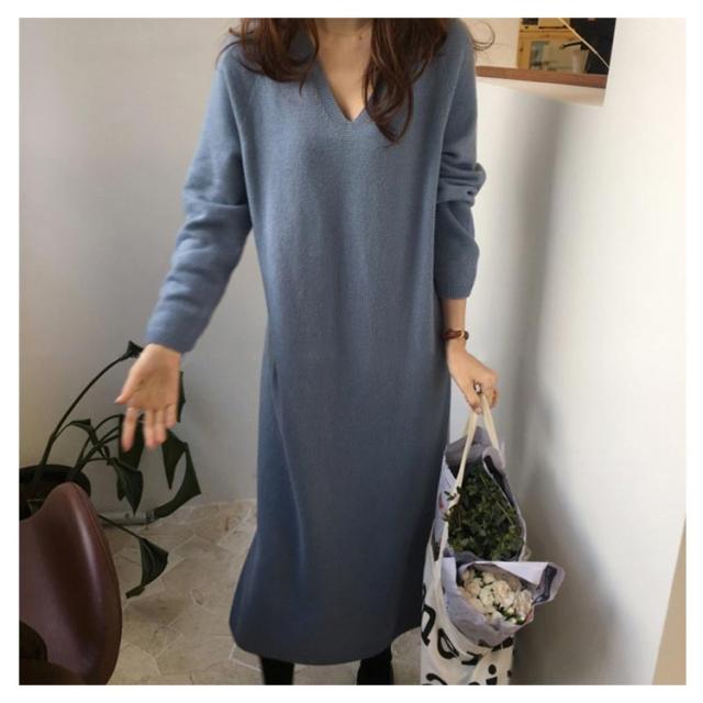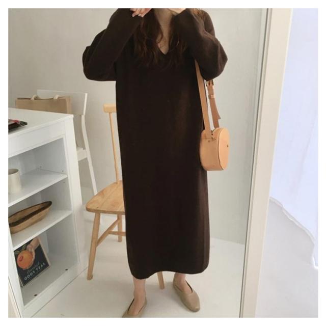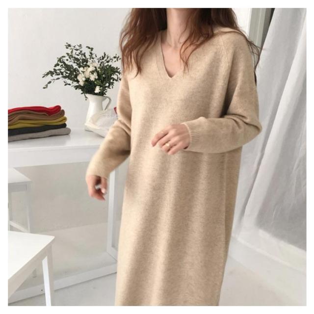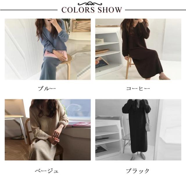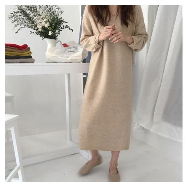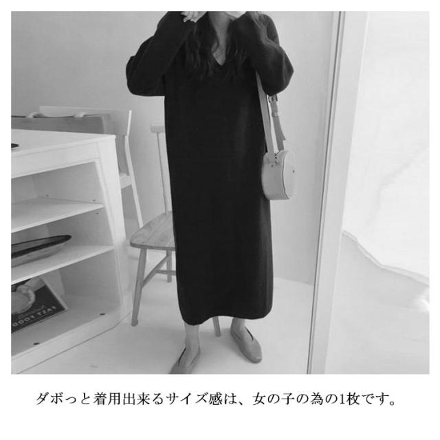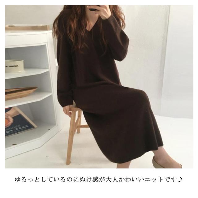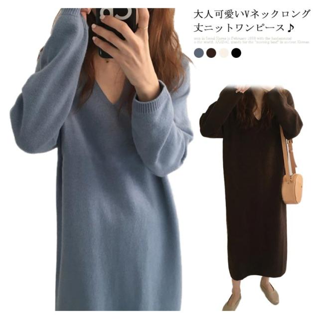 ニットワンピース レディース 春秋冬 ワンピース 長袖 ニットワンピ Vネック マキシ丈ワンピース ロング丈 ニットソー Iライン ゆったり 体型カバー 伸縮性 膝丈 無地 シンプル