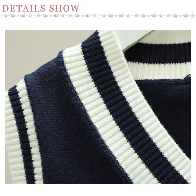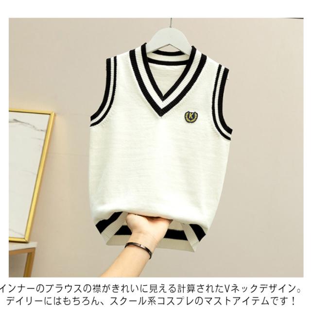 | 制服用やフォーマル用などに大活躍のアイテム!定番のライン入りニットベスト。 肌触りのいい素材で、通年着心地よくご利用いただけます。 インナーのブラウスの襟がきれいに見える計算されたVネックデザイン。 デイリーにはもちろん、スクール系コスプレのマストアイテムです! 学生制服にも、入学式・卒業式、発表会やお受験などセミフォーマルにも最適です。 | |