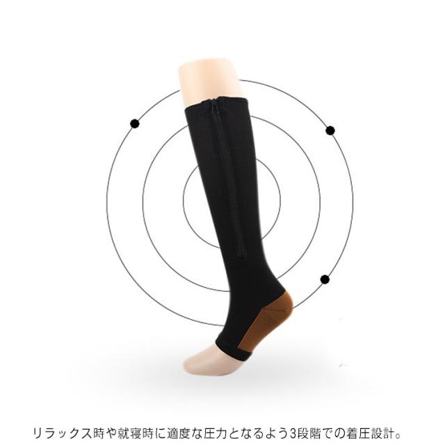 | 履いているだけで両足が一日中リラックスできる着圧ソックスです。 リラックス時や就寝時に適度な圧力となるよう3段階での着圧設計。 通気性に優れ、厚さも丁度良いので季節問わず快適にお使い頂けます。 伸縮性に優れた素材で、フィット感抜群!キュッと引き締め続けむくみもスッキリ! サイドにファスナー仕様で着脱簡単、履き心地もよく感じられます。 | |