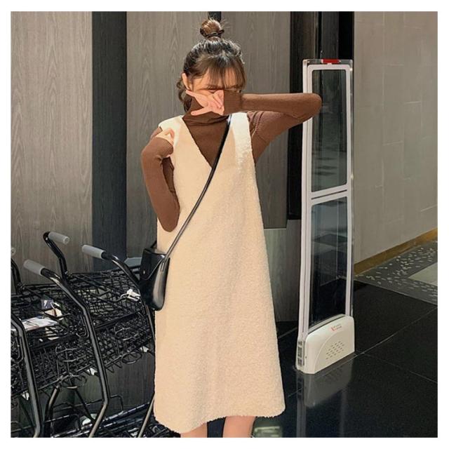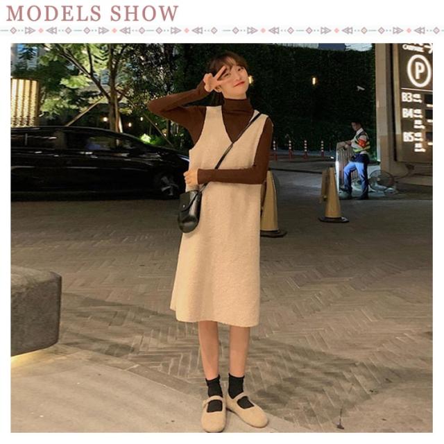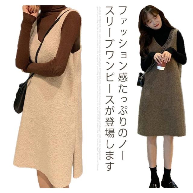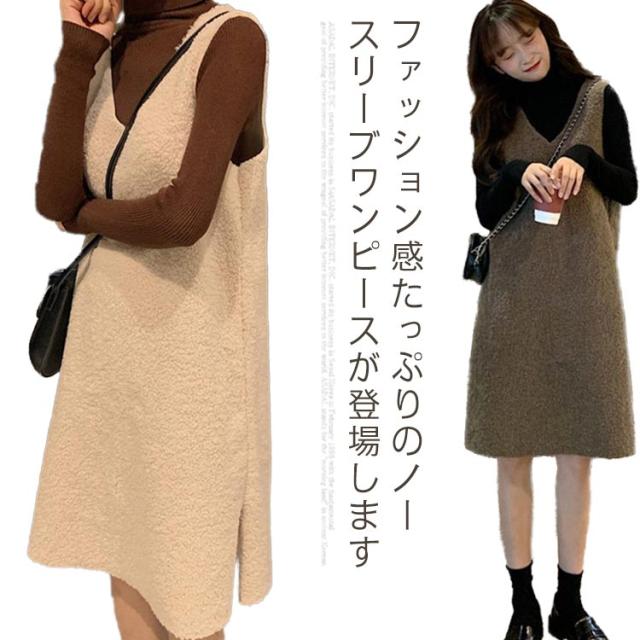ノースリーブ 春秋 長袖 ゆったり シンプル Vネック ワンピース ロング丈 スリット入り 重ね着 レイヤード風 お洒落 普段着 カジュアル 通勤