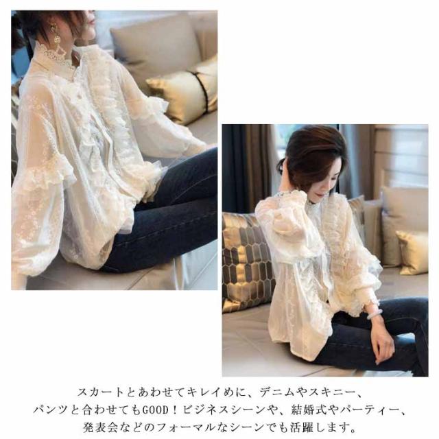 レース シャツ 総レース トップス パフスリーブ 春服 ブラウス レースシャツ 白シャツ ワイシャツ 刺繍 フォーマル 長袖 秋服 春秋 オフィス 通勤 30代 エレガント ホワイト ママ 母 20代 レディース