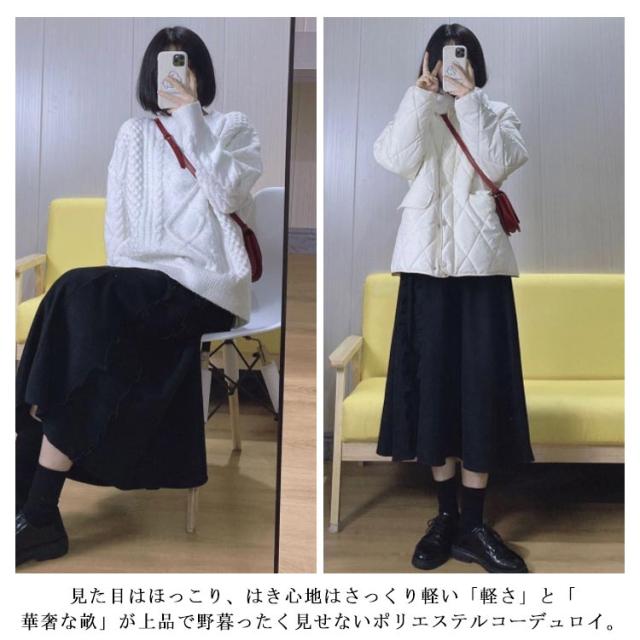 | 軽い着心地!コーデュロイスカート 見た目はほっこり、はき心地はさっくり軽い「軽さ」と「華奢な畝」が上品で野暮ったく見せないポリエステルコーデュロイ。 素材で可愛い♪が特権のコーデュロイ素材を使用したミモレ丈スカート。 ウエストは後ろゴム仕様&たっぷり生地を使用し、プリーツタックを入れることで豊かに広がるAラインが楽しめます。 | |