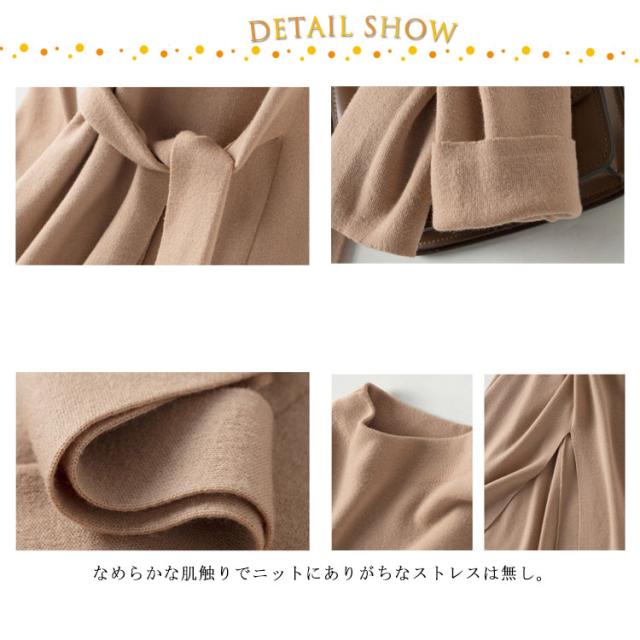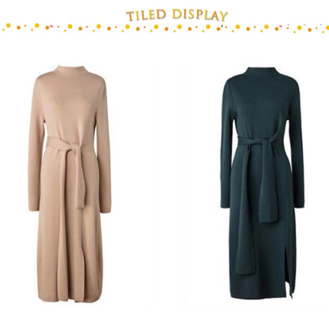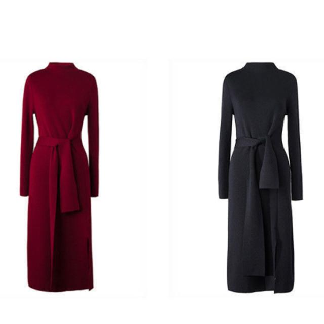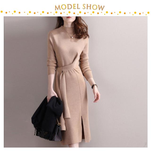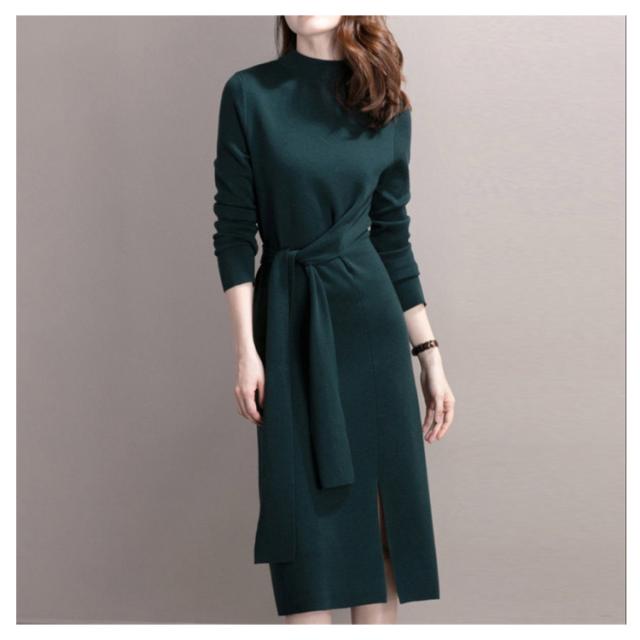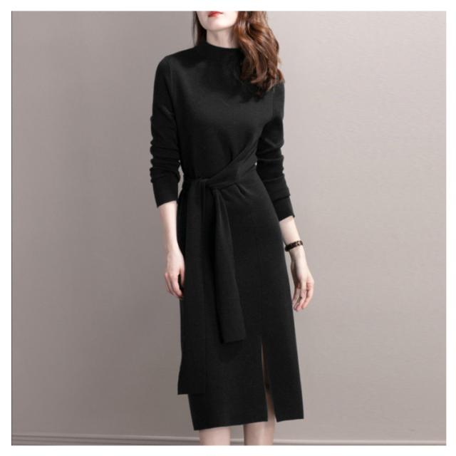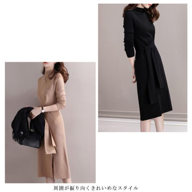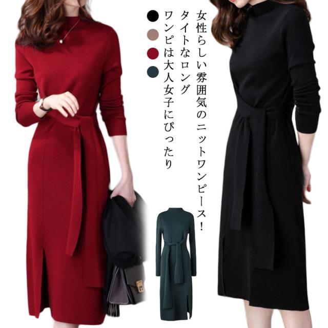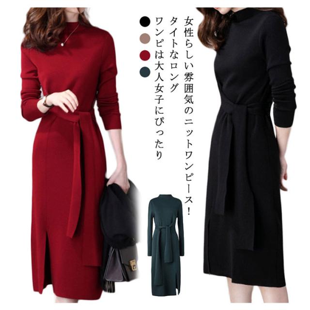 冬コーデ 秋冬 ロングワンピース ニットワンピース レディース ロング ワンピース ボルトネック きれいめ リボン ウエストリボン スリット 秋コーデ タイト