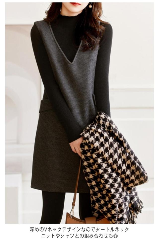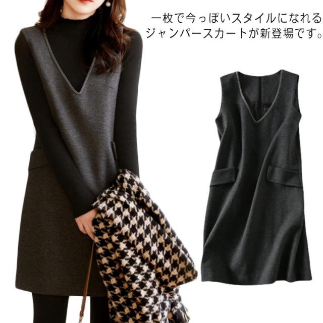 レディース ワンピース ジャンパースカート 重ね着 ジャンパースカート 膝丈ワンピース 春秋冬 Vネック ゆったり 体型カバー ポケット付き 通勤 レイヤード ニット