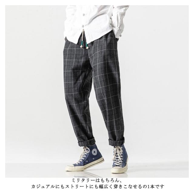 | カジュアルなコーデを選ばず合わせられる毎日履きたいパンツです。 チェック柄が目を引く分、シンプルなカラーでバランスを取ってくれます。 適度なゆとりを持たせルーズフィットシルエットで、気軽に使えるイージーな履き心地。 ウェストにゴム紐があって、サイズ調整可能ですから、締め付け感がなくてもっと快適に着られます。 ミリタリーはもちろん、カジュアルにもストリートにも幅広く穿きこなせるの1本です。 | |