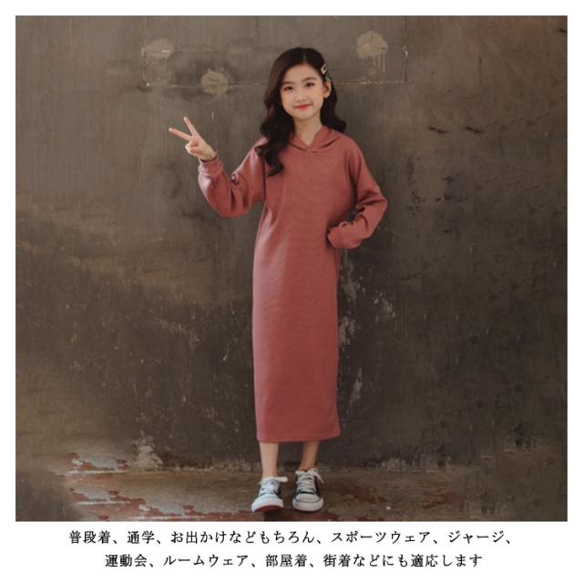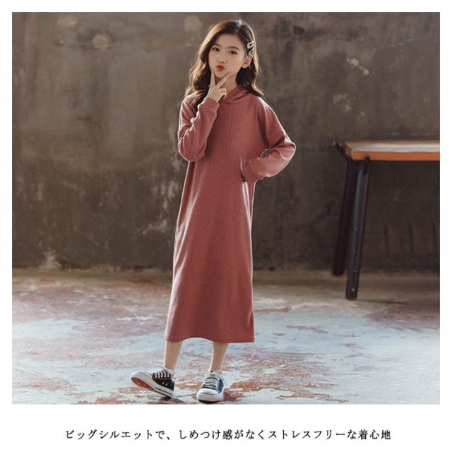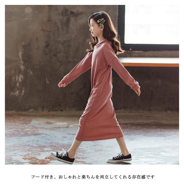 パーカーワンピース 長袖 キッズ フード付きワンピース Aラインワンピ ロング丈ワンピース パーカーワンピ プルオーバー 女の子 ジュニア 子供服 子ども服 春 秋 おしゃれ 110 120 130 140 150