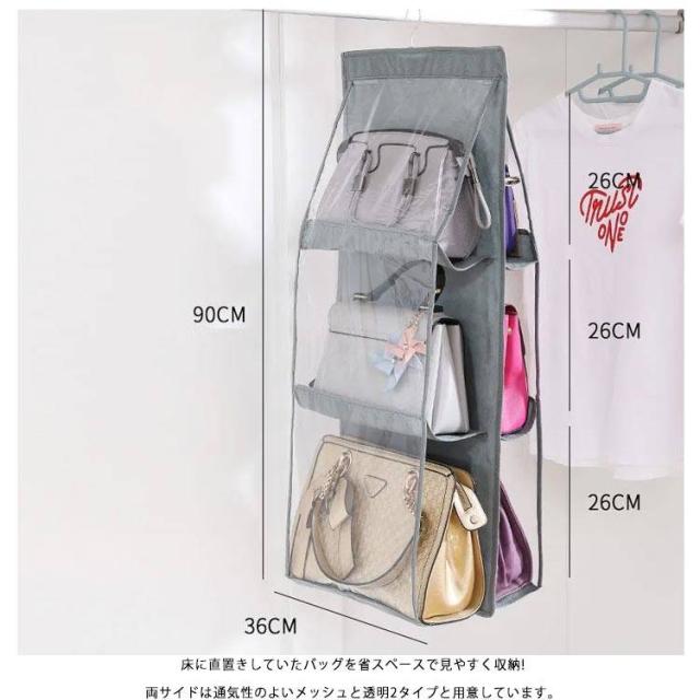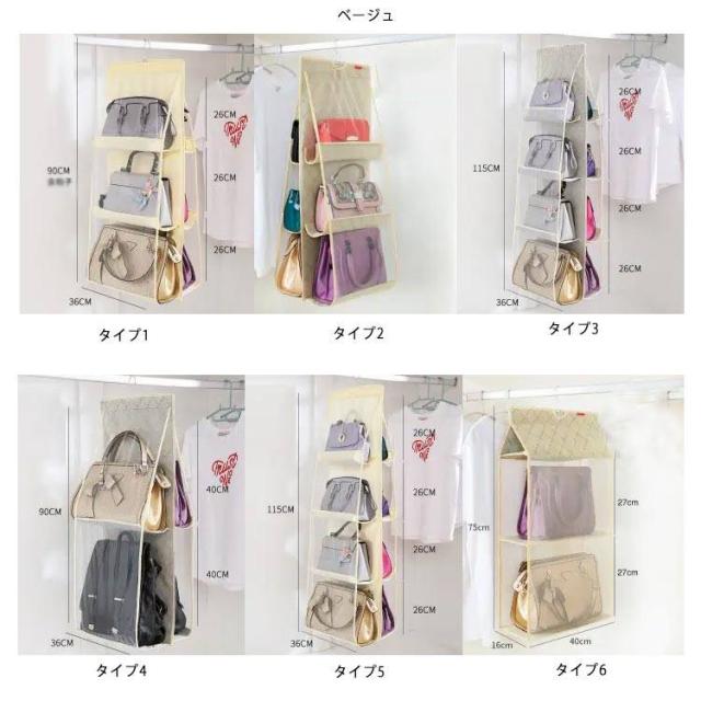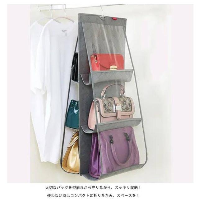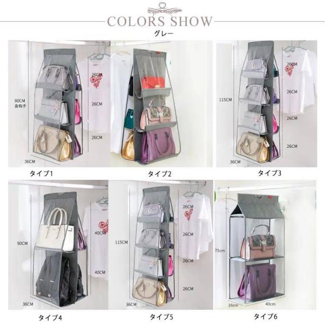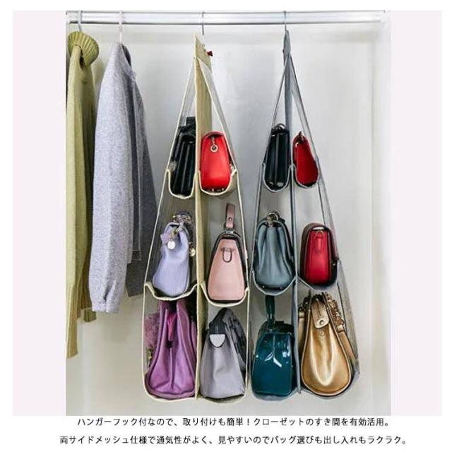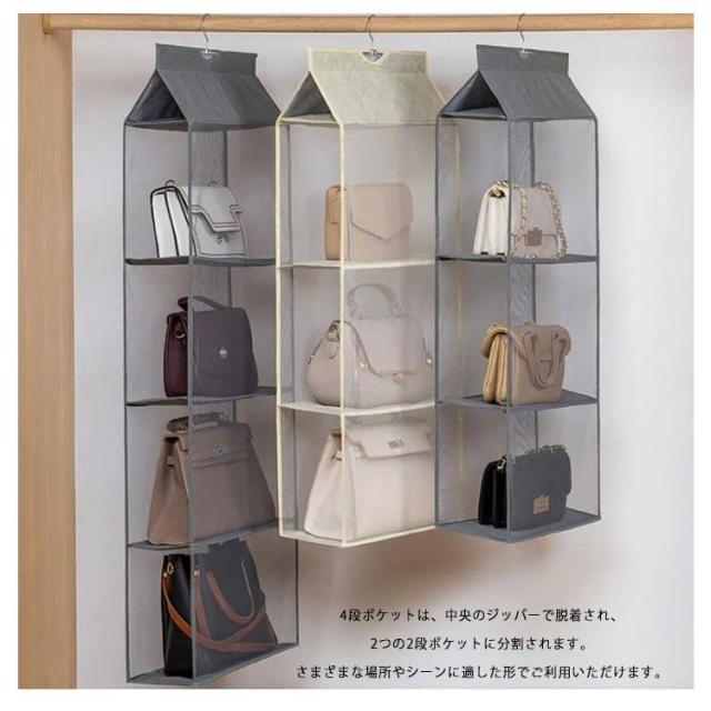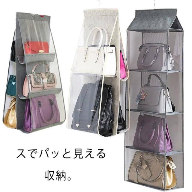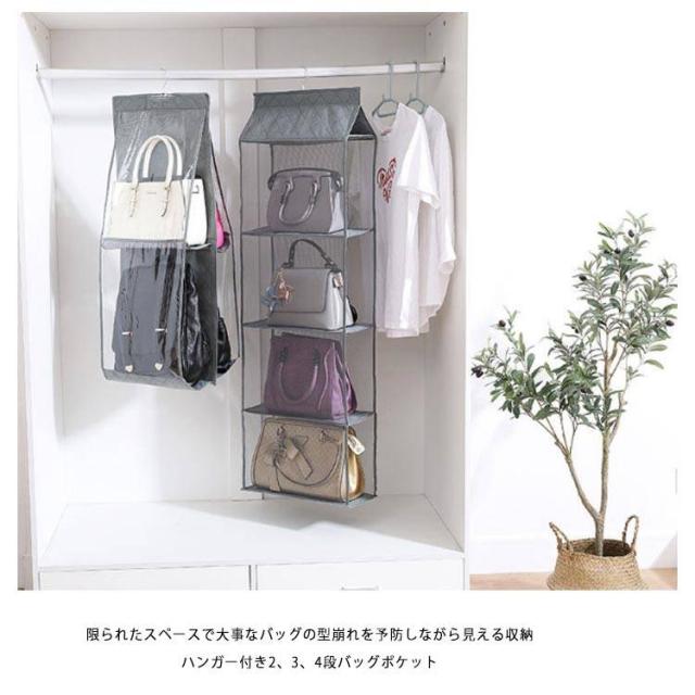 | バッグを自立させながら狭いスペースでパッと見える収納。 限られたスペースで大事なバッグの型崩れを予防しながら見える収納 ハンガー付き2、3、4段バッグポケット カバン同士がぶつからずさっと取り出せるので、こすれたりキズがつきにくい くたっとしたバッグでもシワができにくい (バッグに詰め物にすれば、さらにシワ予防) メッシュ素材で通気性がいいので、ほこりやカビも予防できます。 ハンガーごと移動できるので模様替えやお手入れに便利、ビジネスバッグもシーズンオフバッグもOK! 4段ポケットは、中央のジッパーで脱着され、2つの2段ポケットに分割されます。さまざまな場所やシーンに適した形でご利用いただけます。 バッグはもちろん、財布やストールなど小さなアイテム、お子さまのおもちゃやベビー服も収納可能です。 大切なバッグを型崩れから守りながら、スッキリ収納! ハンガーフック付なので、取り付けも簡単!クローゼットのすき間を有効活用。 両サイドメッシュ仕様で通気性がよく、見やすいのでバッグ選びも出し入れもラクラク。 使わない時はコンパクトに折りたたみ、スペースを! 床に直置きしていたバッグを省スペースで見やすく収納! 両サイドは通気性のよいメッシュと透明2タイプと用意しています。 | |