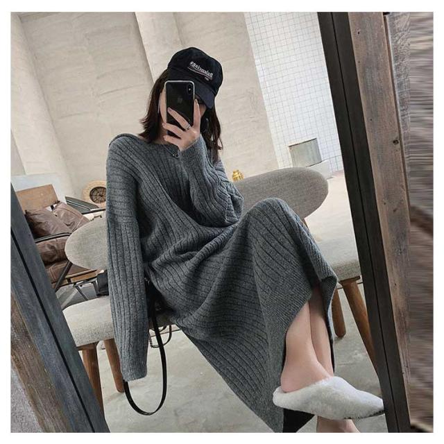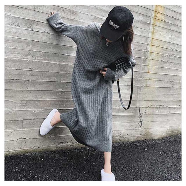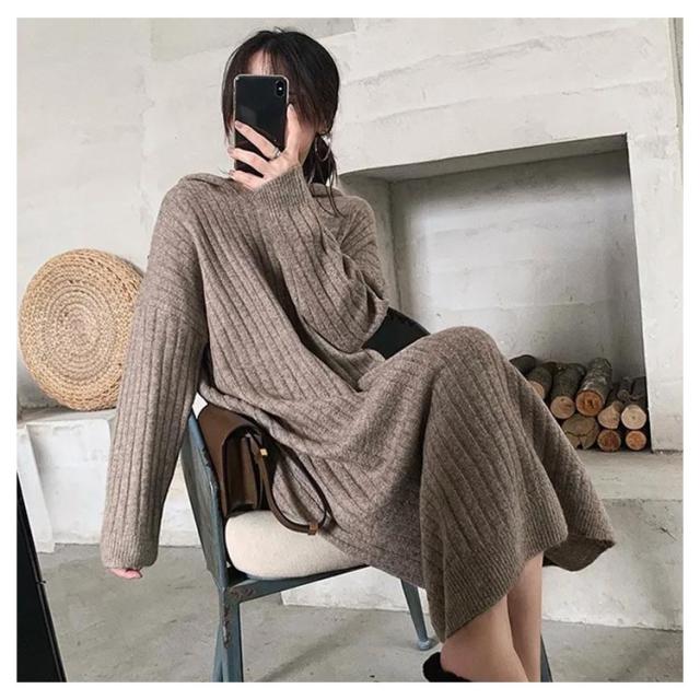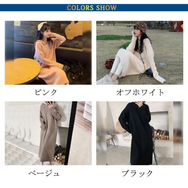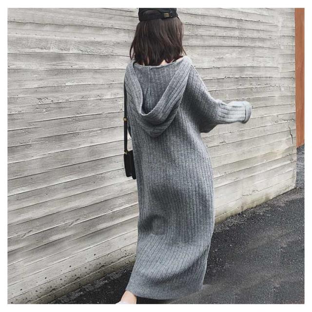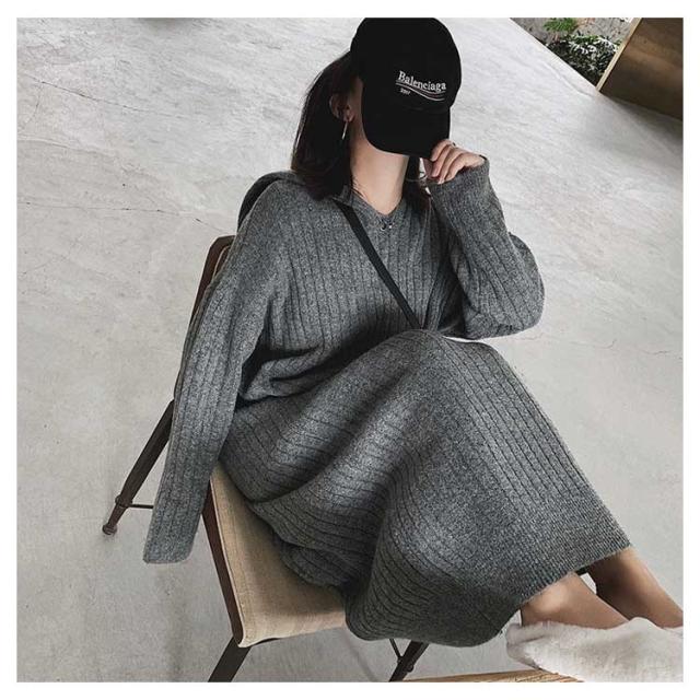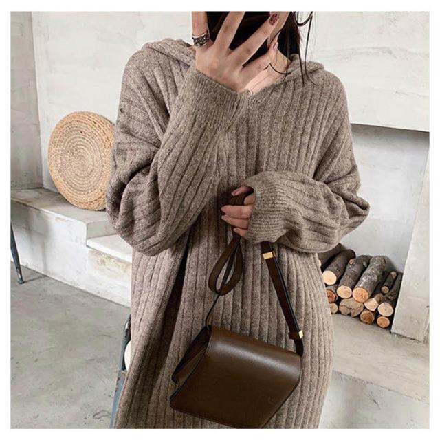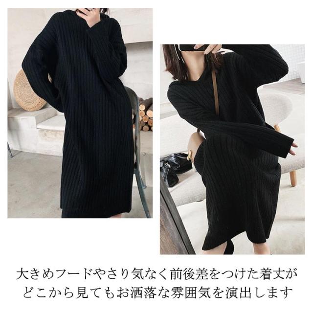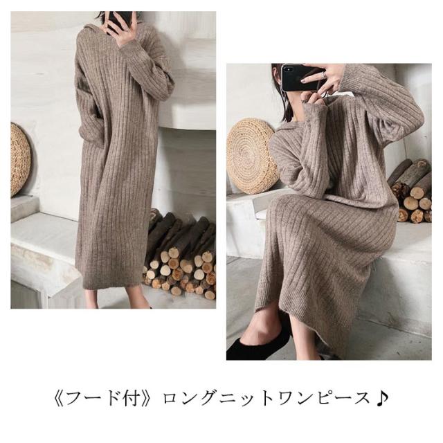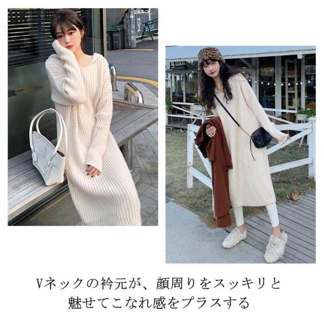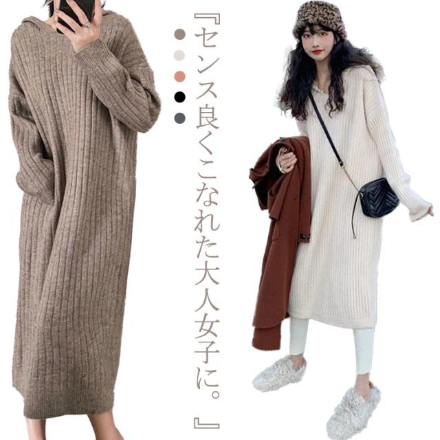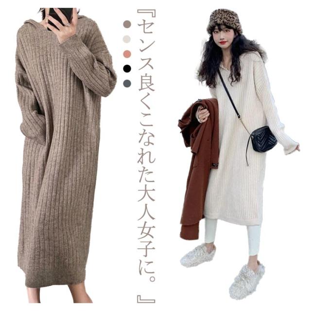マキシ丈 ロング ニットワンピース ワンピース ブニット 体型カバー フード付 長袖 オーバーサイズ Vネック おしゃれ ゆったり ニット きれいめ カジュアル トレンド 着痩せ 無地 カジュアル