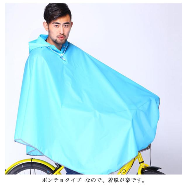 | 大きな ツバも 付いているので、濡れにくい! ポンチョタイプ なので、着脱が楽です。 裾に反射素材を使用しています。 | |