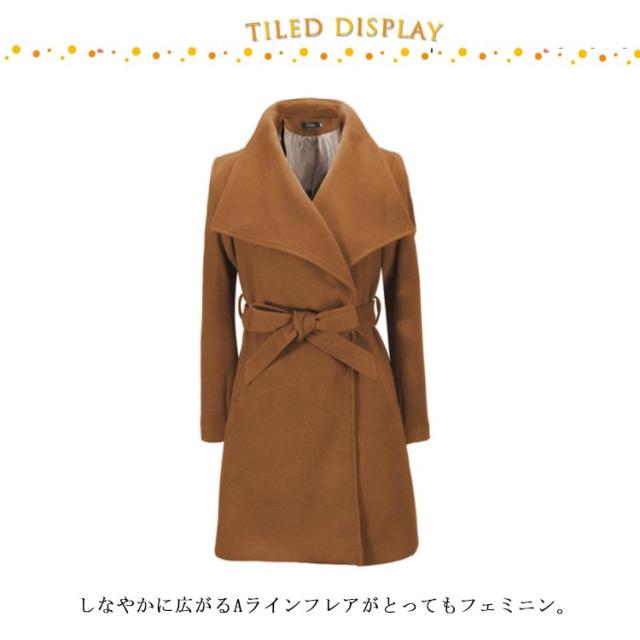 | ベルトリポンでつくるウエスト絞りが大人の女性を演出する美麗シルエットコート。 しなやかに広がるAラインフレアがとってもフェミニン。 シックな?囲気と高級感を釀してくれるウール風生地。 便利でうれしいサイドポケット付き。裏地も付いているからいつまでもシルエット綺麗。 | |