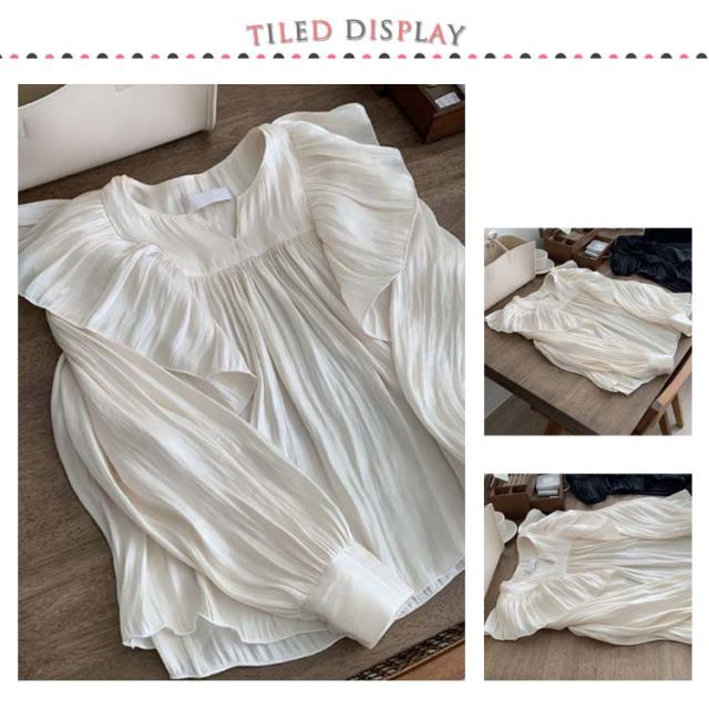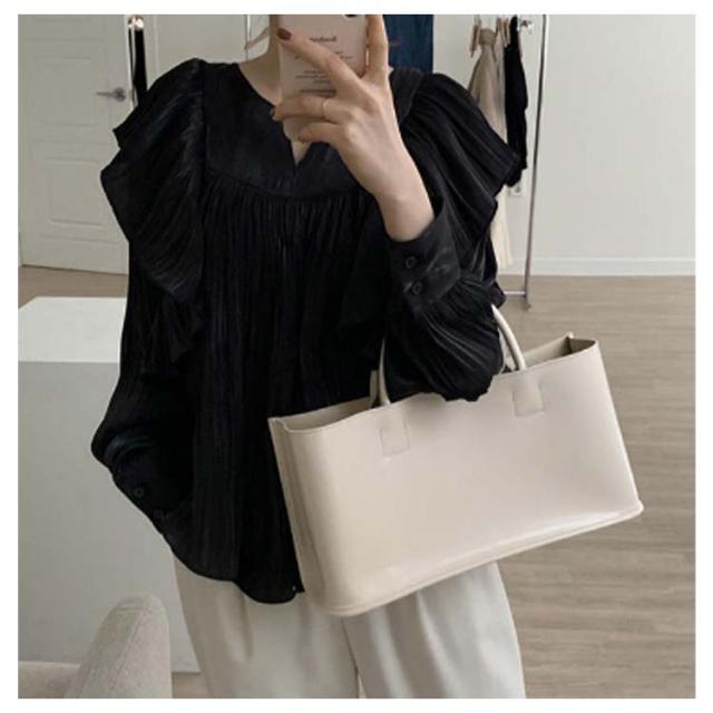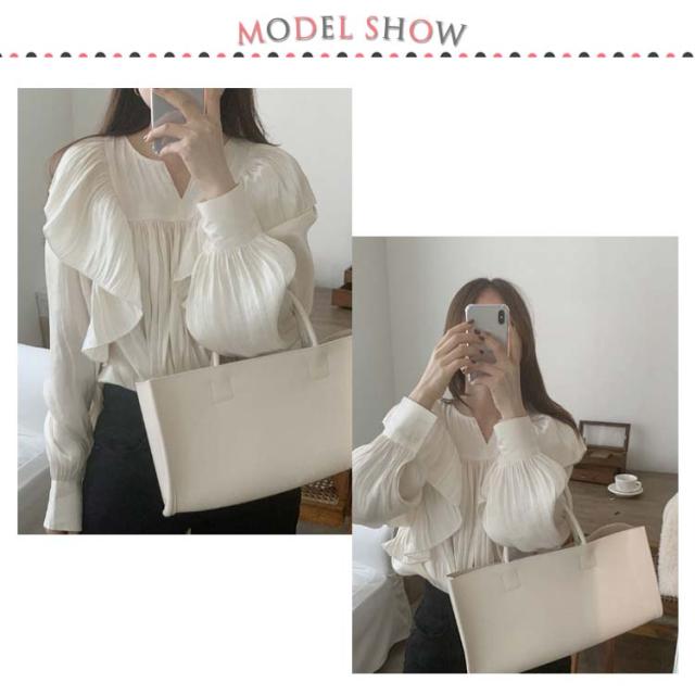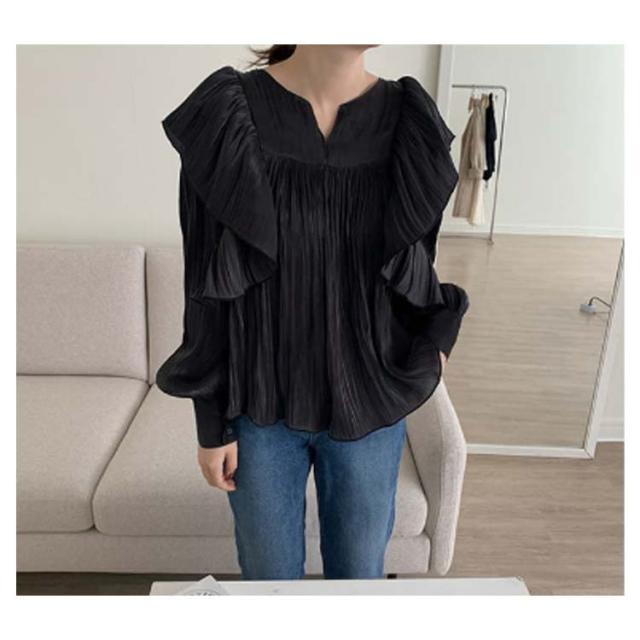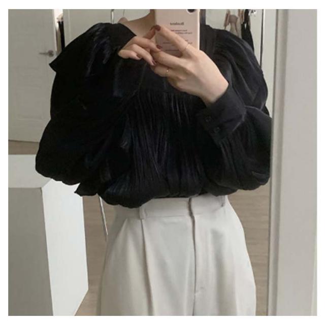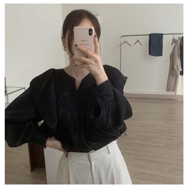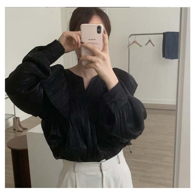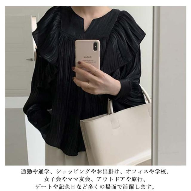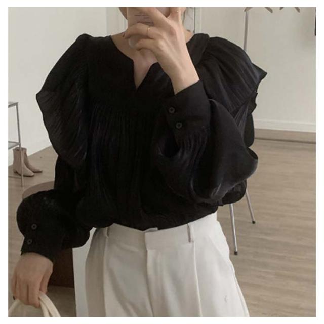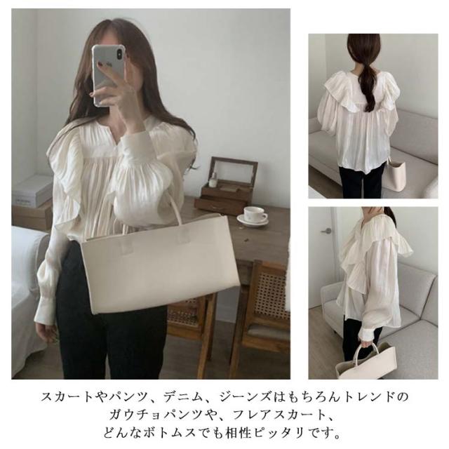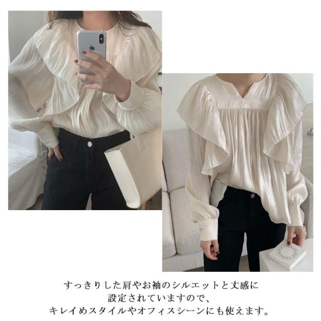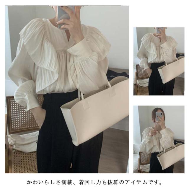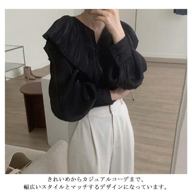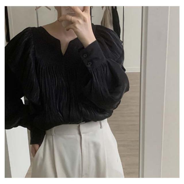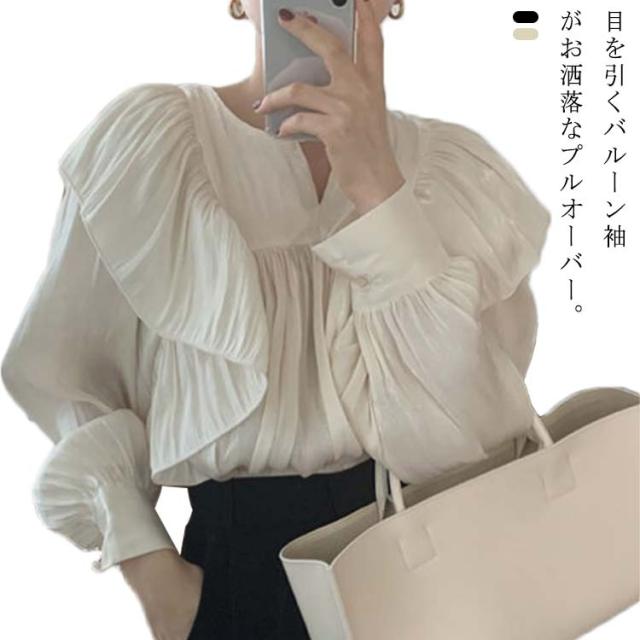 ブラウス レディース 長袖 バルーンブラウス ボリューム袖 トップス タックブラウス タック フリル インナー Vネック バルーンスリーブ バルーン袖 フォーマル オフィス 春 秋 クラシカル フェミニン エレガント