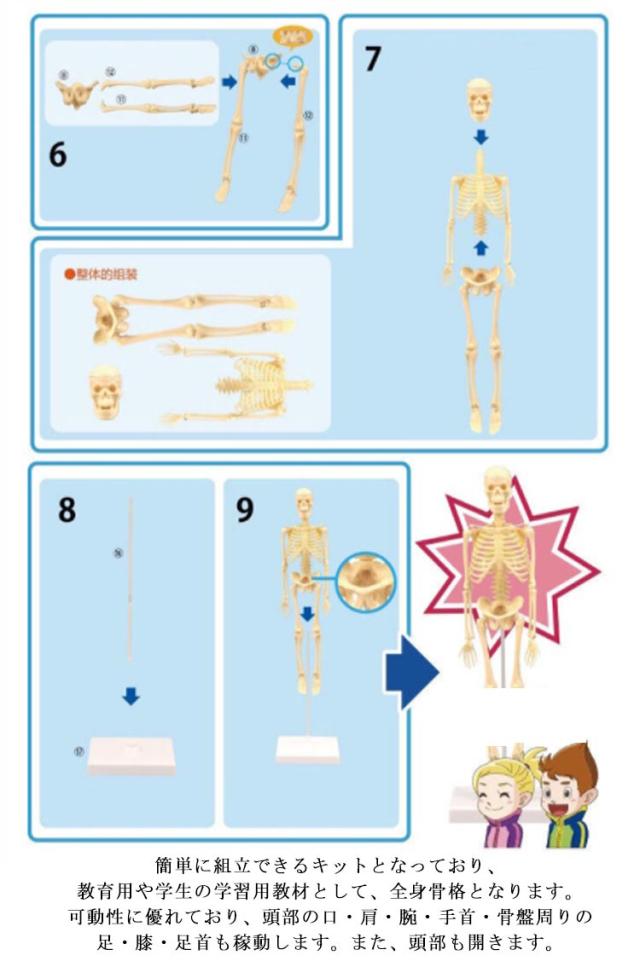 | 台座から外して自由にポーズが出来る ・台座付きの人体骨格標本 35cm の骨格模型となります。簡単に組立できるキットとなっており、教育用や学生の学習用教材として、全身骨格となります。 ・簡単に組立できるキットとなっており、教育用や学生の学習用教材として、全身骨格となります。可動性に優れており、頭部の口・肩・腕・手首・骨盤周りの足・膝・足首も稼動します。また、頭部も開きます。 | |