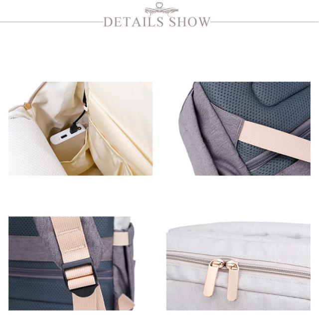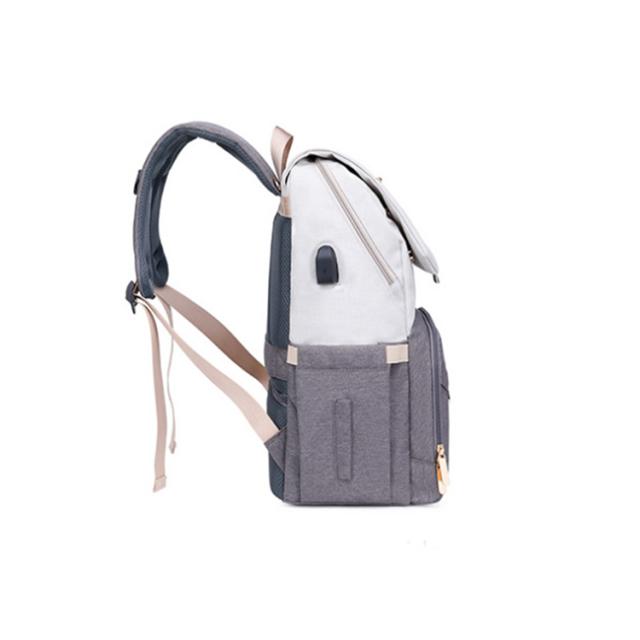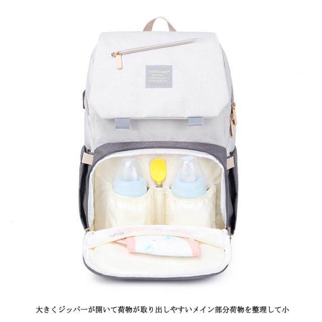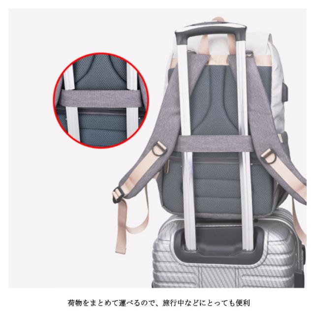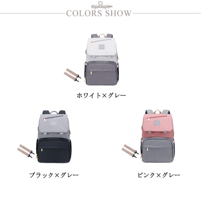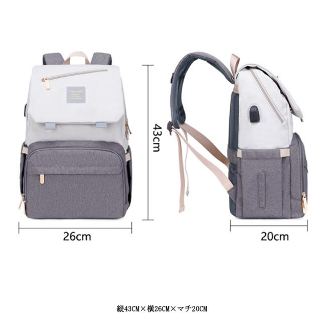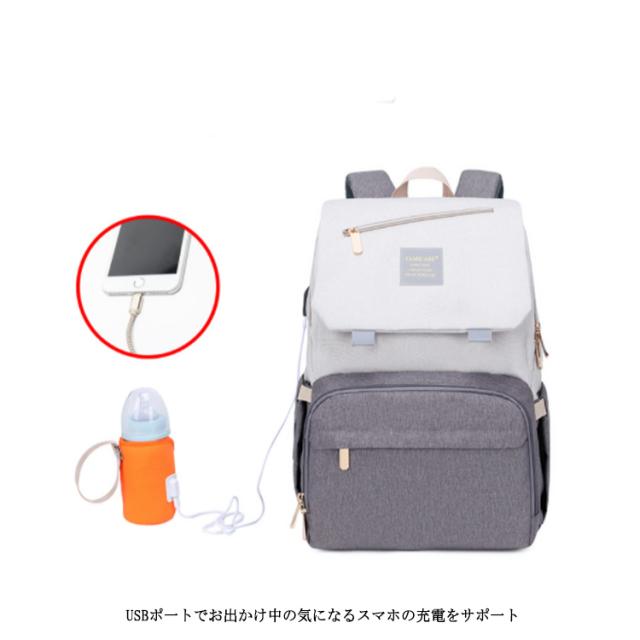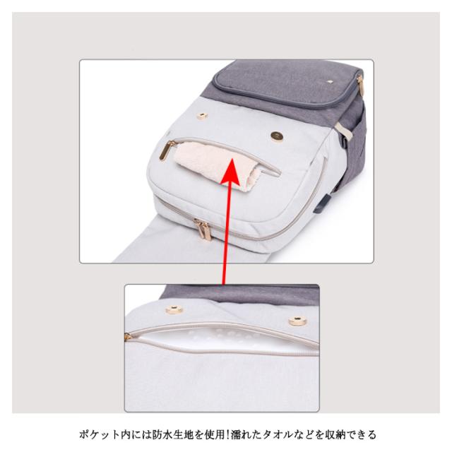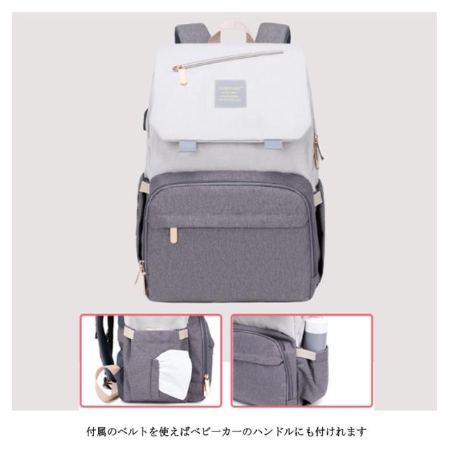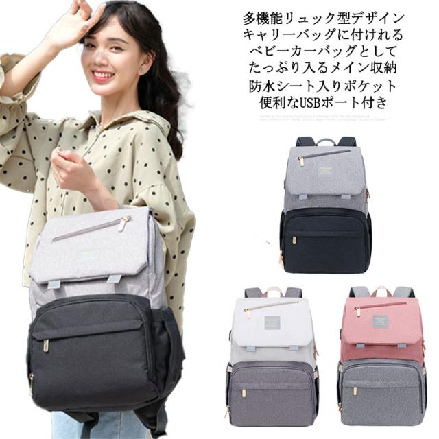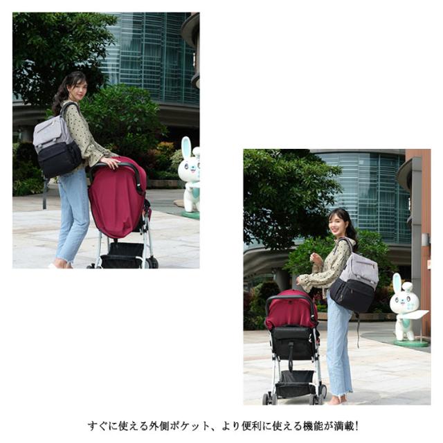 | 多機能リュック型デザイン すぐに使える外側ポケット、より便利に使える機能が満載! たっぷり入るメイン収納 大きくジッパ一が開いて荷物が取り出しやすいメイン部分荷物を整理して小分けできるポケット付き。 べビ一カ一バッグとして 付属のベルトを使えばべビ一カ一のハンドルにも付けれます。 便利なUSBポ一ト付き USBポ一トでお出かけ中の気になるスマホの充電をサポ一ト。 キャリ一バッグに付けれる 荷物をまとめて運べるので、旅行中などにとっても便利。 防水シ一ト入りポケット ポケット内には防水生地を使用!濡れたタオルなどを収納できる。 | |