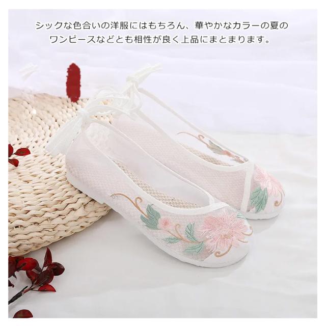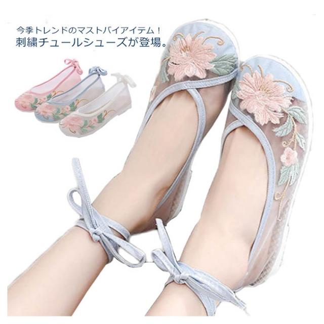 痛くない 刺繍チュールシューズ ローヒール やわらかい 刺繍パンプス 透け レディース フラットシューズ 刺繍 刺繍 ぺたんこ チュール 靴 花柄 チャイナシューズ シアー 人気 メッシュ チャイナシューズ パステル 楽ちん トレンド