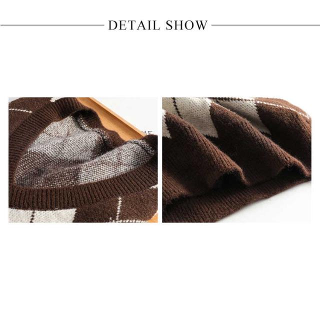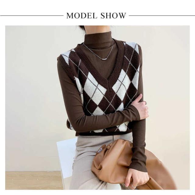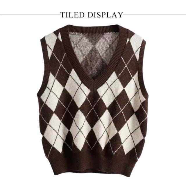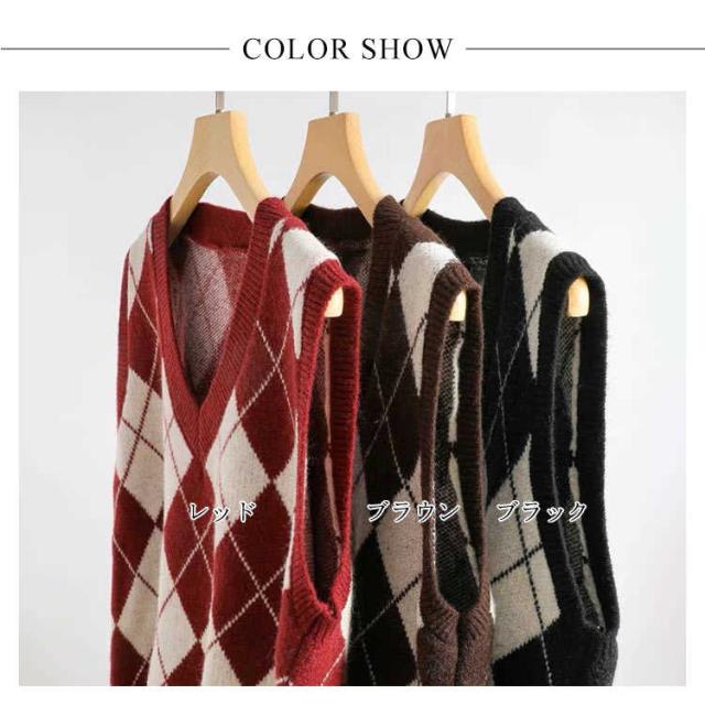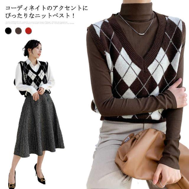 ショートベスト レディース チェック ニットベスト 通学 アーガイル柄 秋冬 Vネック レイヤード プルオーバー ゆったり ショート丈 ニット リブニット ニットトップス 重ね着 ベスト シンプル かわいい 通勤 ノースリーブ
