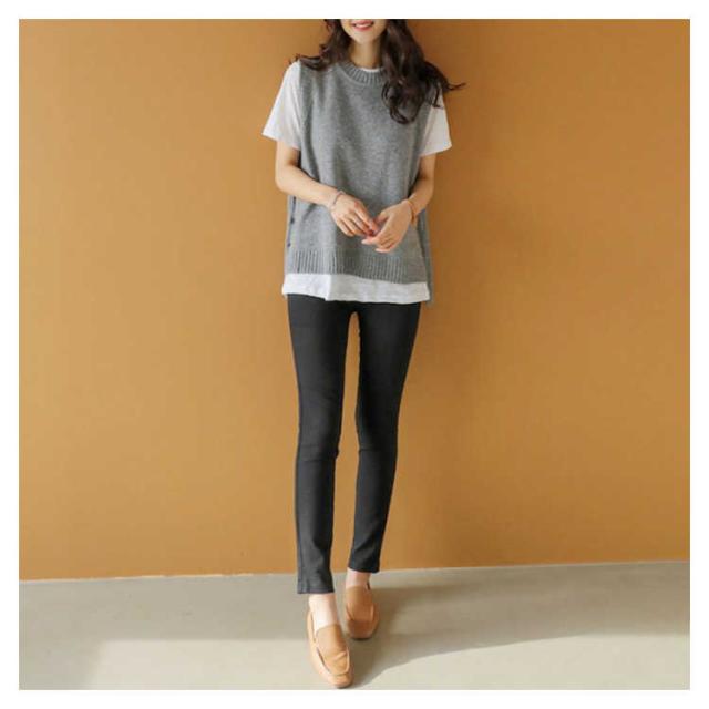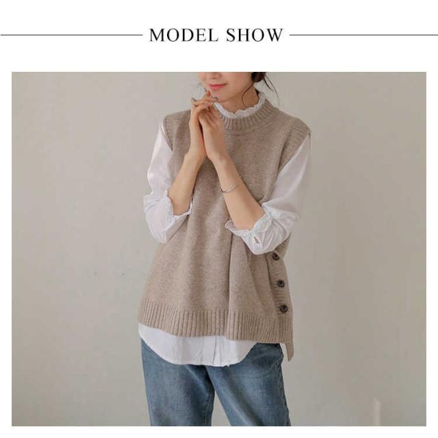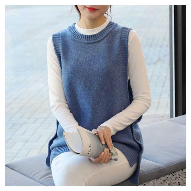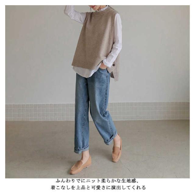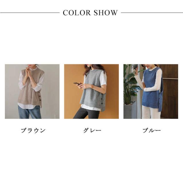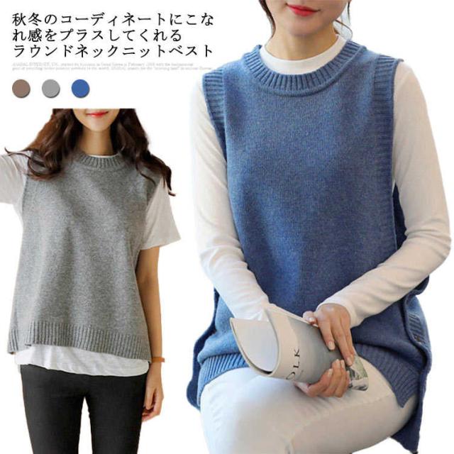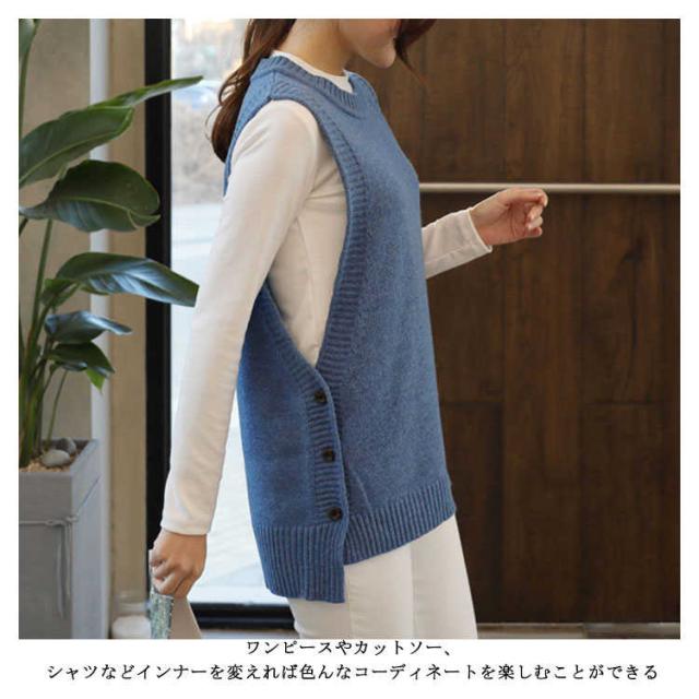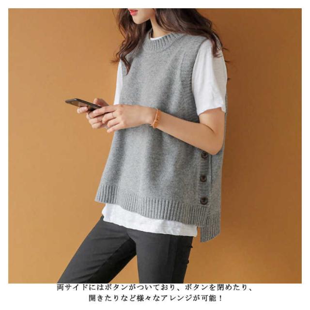 ジレ 秋冬 ゆったり チョッキ ジレベスト ボタン付き ニットベスト レディース クルーネック 丸首 シンプル ニット テールカット 無地ニット ベスト ノースリーブ カジュアル トップス お洒落 プルオーバー ルーズ スリット入り 重ね着 レイヤード キレイめ ベスト