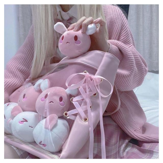 | 機能性にもかわいさにもこだわったリボン痛バッグが新登場。 レースアップデザインが可愛さをたくさん詰まりました! クリア部分には、お気に入りの写真や小物などを入れられる遊び心あるデザイン。 型崩れしにくいしっかりとした生地、底に厚みを持たせるデザインなので床置でも自立します。 パッグとポーチが別々ですので、中のポーチが取り外せるので缶バツチ等の取り付けがラクラク。 A4サイズも雑誌もしっかり収納出来る大容量のでイペントやおでかけにも最適! | |