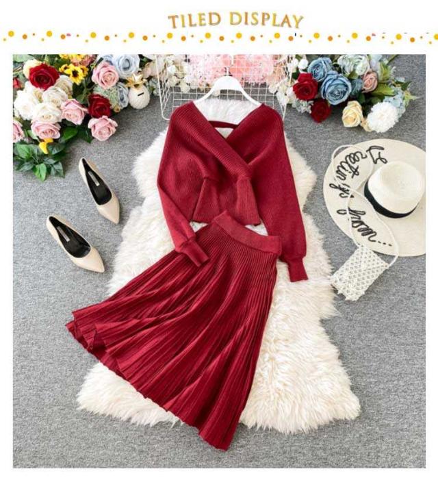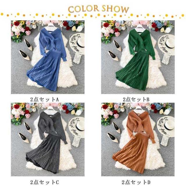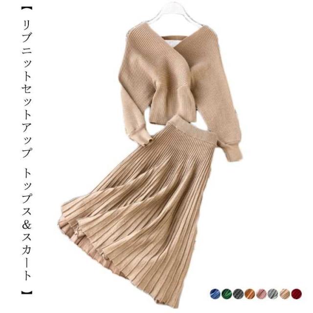 フレアスカート レディース ニットアップ ニット リブニットセットアップ プリーツスカート トップス 2点セット 長袖 vネック セーター 春秋 ミモレ丈 オフィス 無地 着回し 黒 ブラック ニットセットアップ