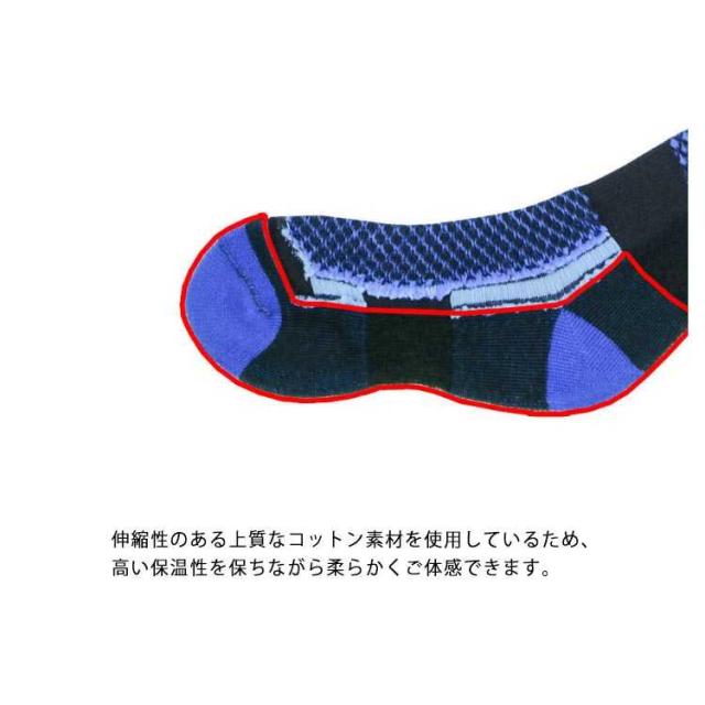 | 独自の段階的着圧設計を採用し、アウトドア専用設計。 足裏部分に厚めのパイル編みでクッション性を高め、着地の衝撃を弱め、疲れを和らげます。 伸縮性のある上質なコットン素材を使用しているため、高い保温性を保ちながら柔らかくご体感できます。 スキー、スノーボードはもちろん、登山、ランニング、トレッキング、キャンプなど様々なアウトドアスポーツに幅広くご使用いただけます。 | |