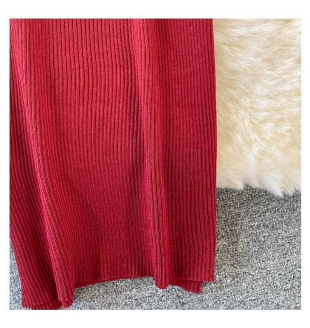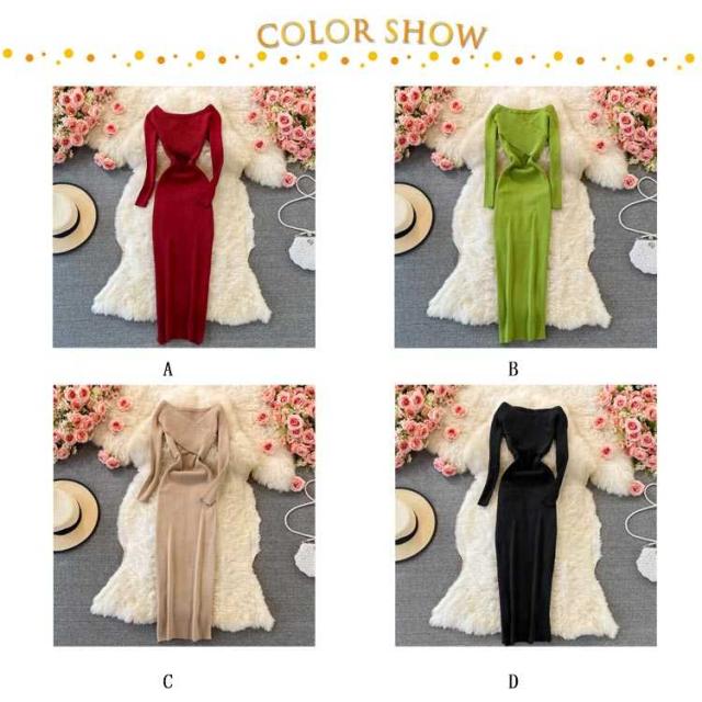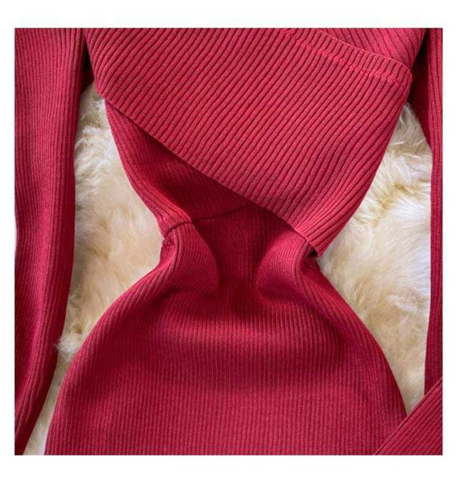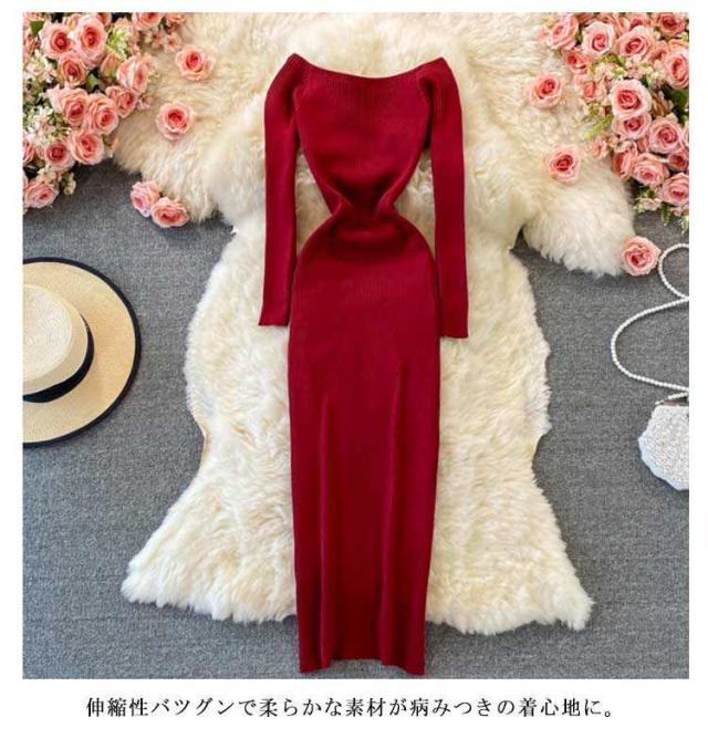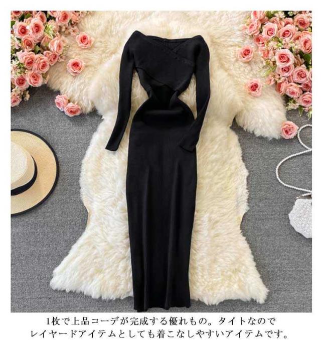 タイトワンピース Vネック リブ リブ 長袖 タイトニットワンピース タイト ニットワンピース ロング丈 ひざたけ タイトニット 膝丈 秋冬 春秋 ニット ロングニットワンピース