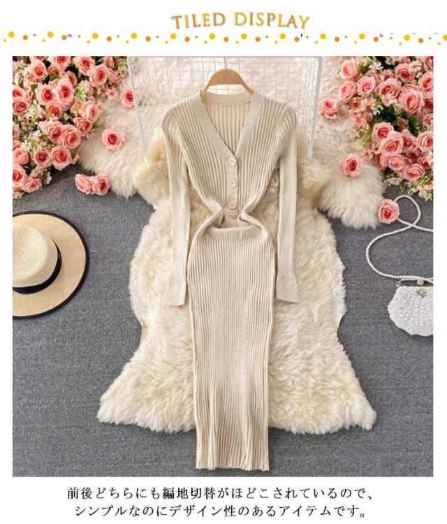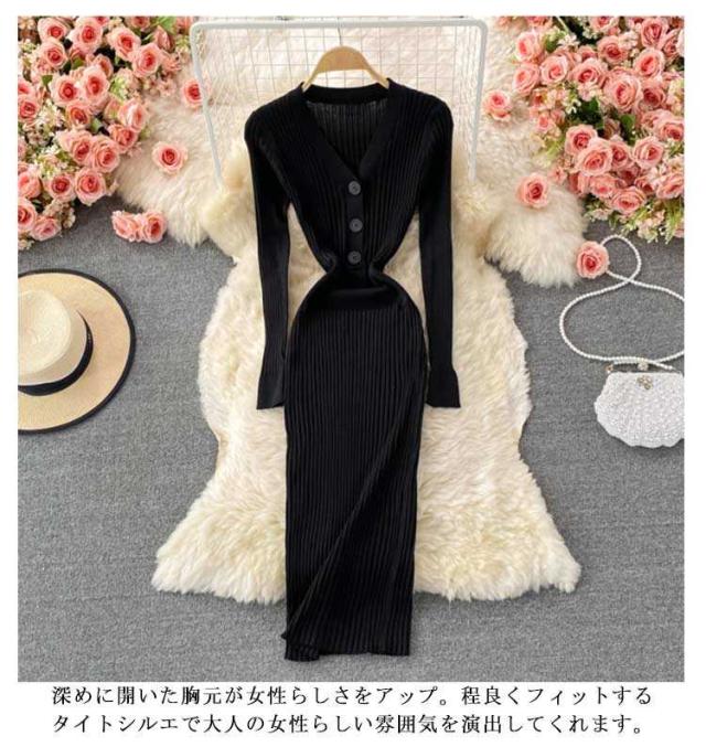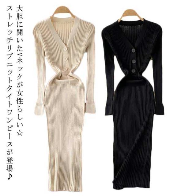 長袖 タイトワンピース タイトニット ロングニットワンピース Vネック タイトワンピース ロング丈 リブ タイトニットワンピース タイト ひざたけ 膝丈 ニットワンピース 春秋 ニット 秋冬