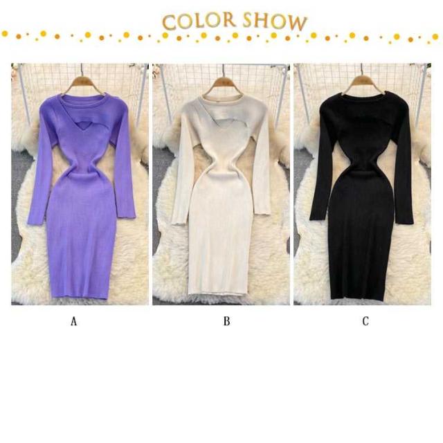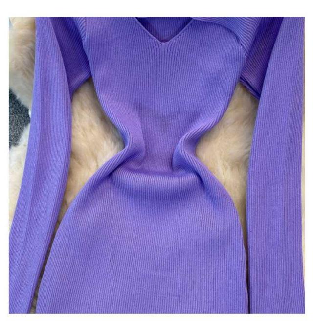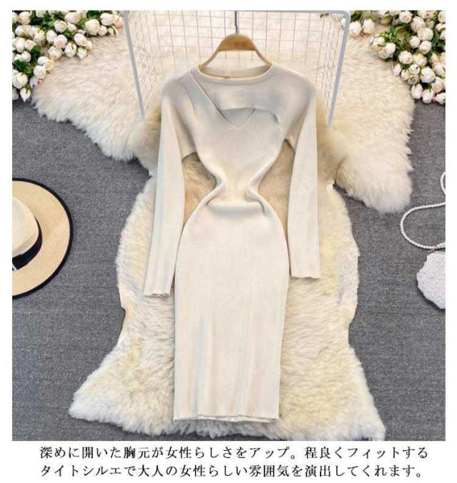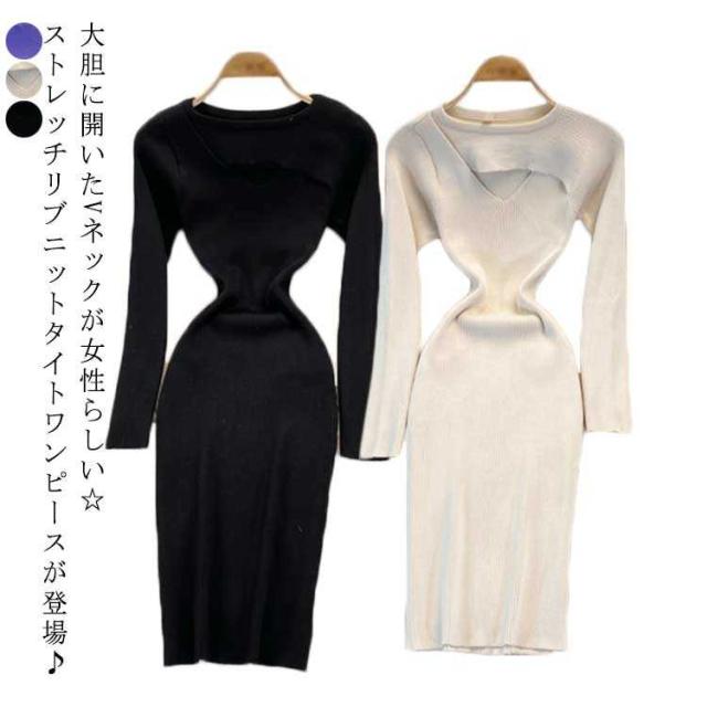 タイトニットワンピース リブ Vネック タイトニット タイト 長袖 タイトワンピース ニットワンピース ロング丈 ひざたけ ニット 膝丈 秋冬 春秋 タイト ロングニットワンピース