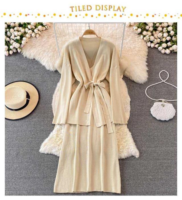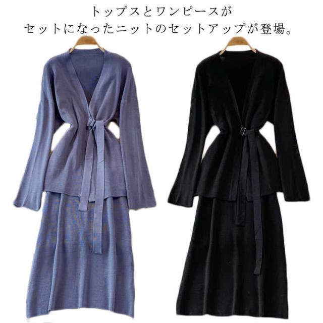 | トップスとワンピースがセットになったニットのセットアップが登場。 カーディガンンとしても使えるトップスとエレガントなラインのワンピースは分けて着られるから、 コーデの幅がグンと広がります。 | |