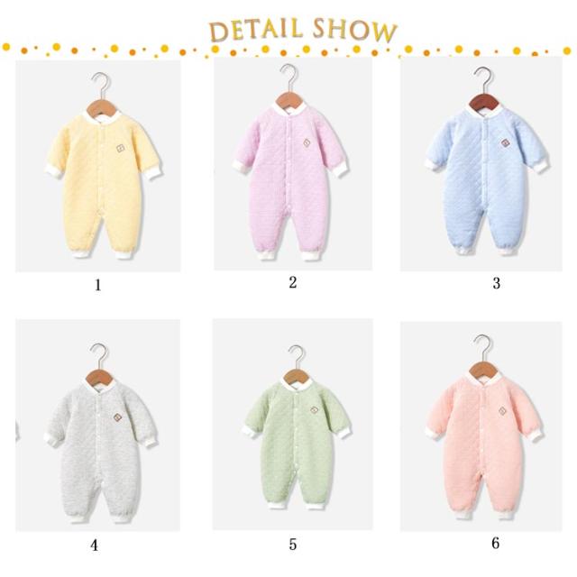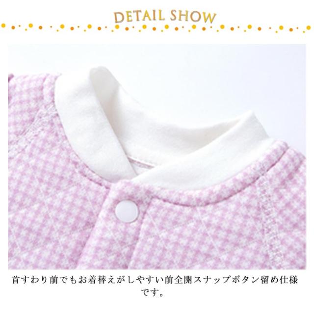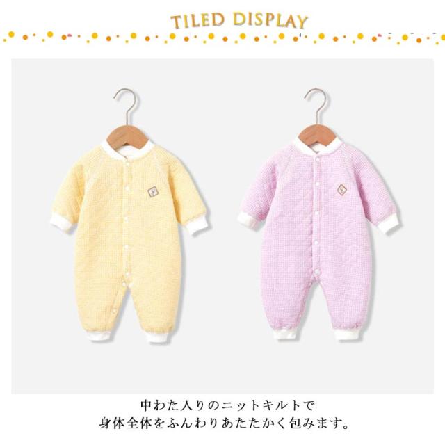 | 肌に優しいベビーパジャマ。 肌にやさしい綿100%素材を採用、柔らかくて着心地抜群! 首すわり前でもお着替えがしやすい前全開スナップボタン留め仕様です。 中わた入りのニットキルトで身体全体をふんわりあたたかく包みます。 カバーオールタイプなので、寝ている間にお腹が冷えてしまう心配もありません。 | |