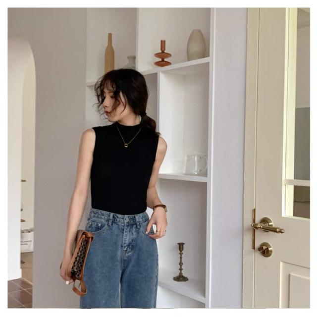 イエロー ハイネック タートルネック ニット レディース サマーニット ノースリーブ ニットセーター タートルネック 重ね着 リブニット リブ編み 白 ベージュ ニット 黄色 黒 ブラウン