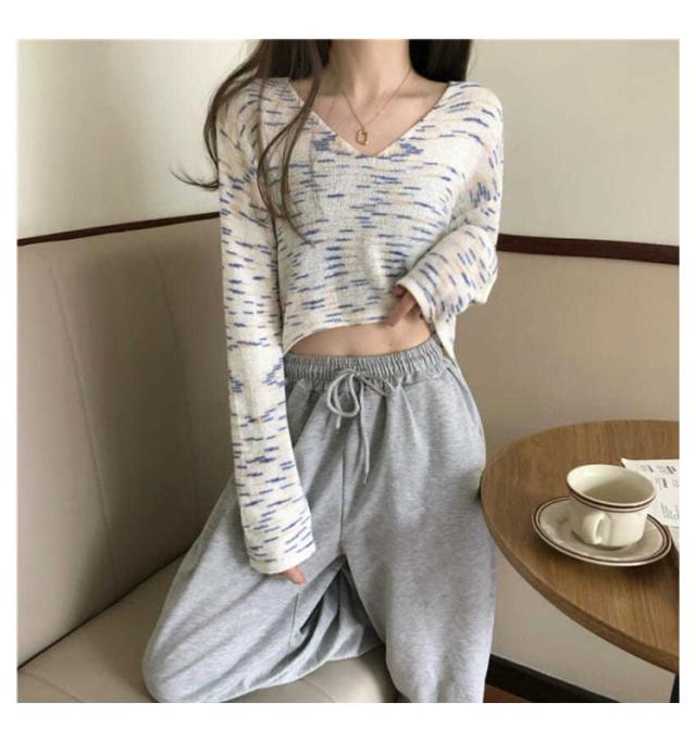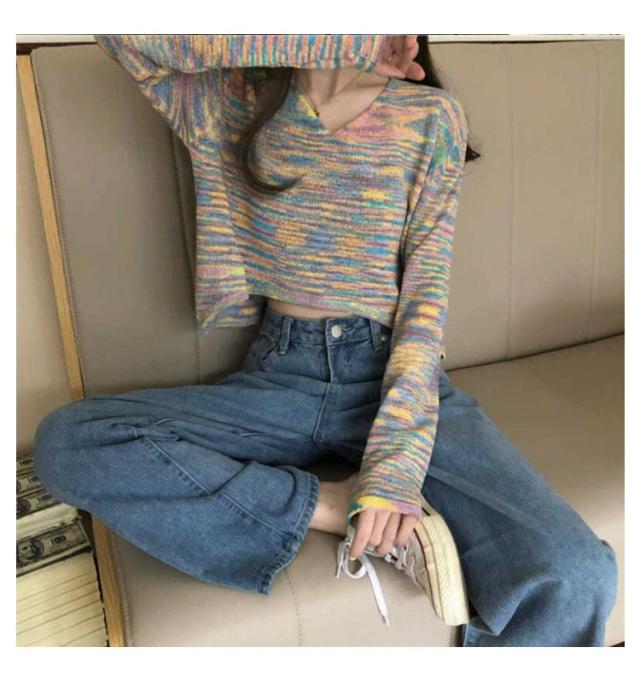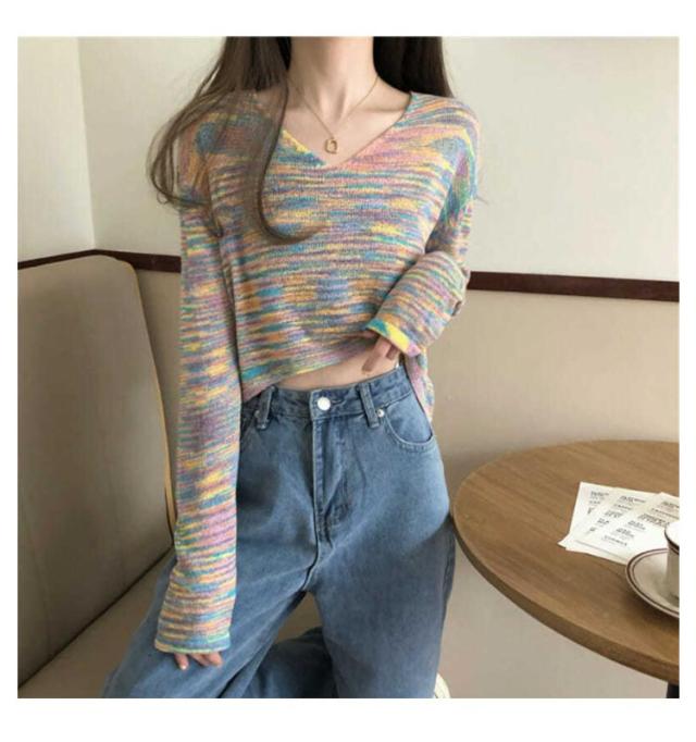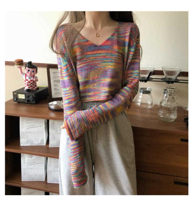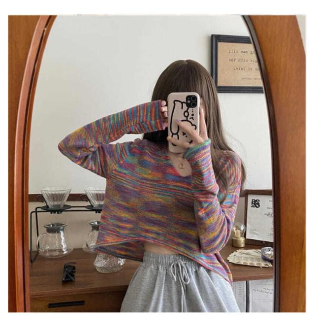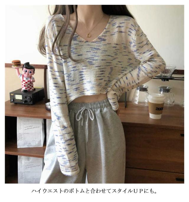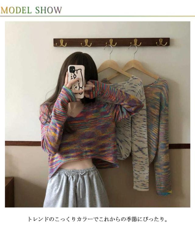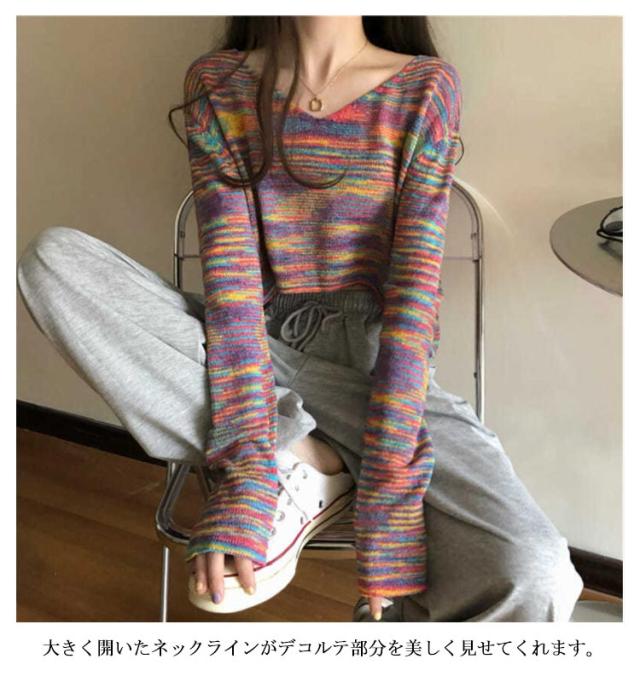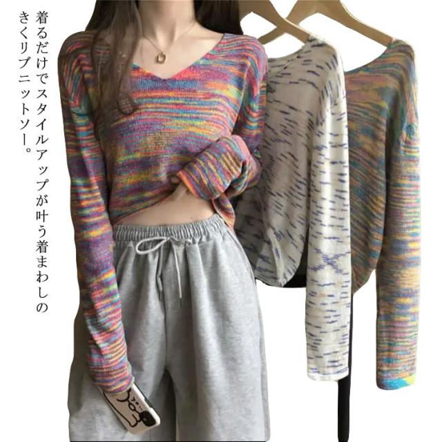 ダンス衣装 リブニット トップス ニットソー へそ出し ニット ショート丈 レディース 長袖 かっこいい スリムニット Vネック カジュアル tシャツ セクシー シンプル tシャツ 無地 杢 虹色 薄手 ヒップホップ ストリート系 10代 20代 リブ地