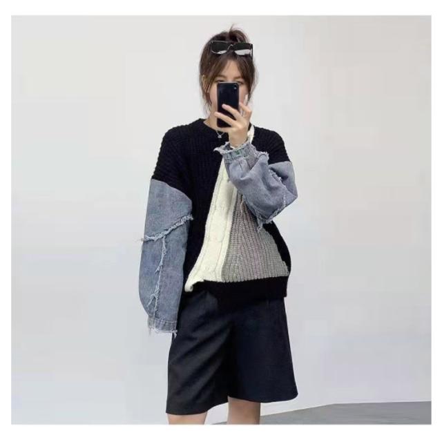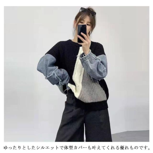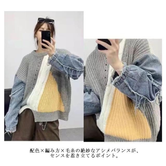 デニム ニット プルオーバー セーター レディース デニム トップス 切り替え ニットセーター クルーネック 長袖 秋冬 デニムコンビ リブ編み アシンメトリー シャギー 切替 配色 ダメージ加工 ローゲージ ニット