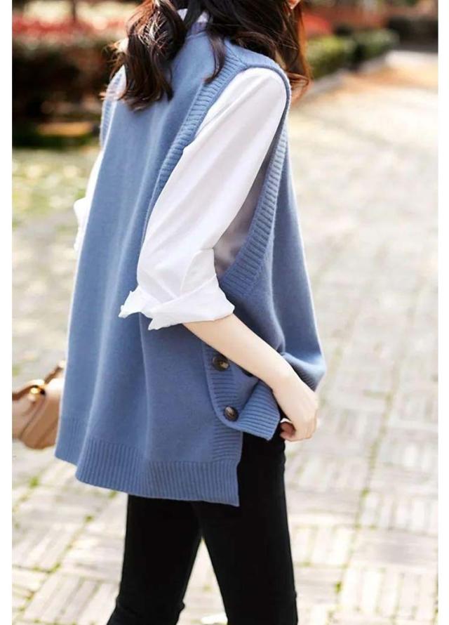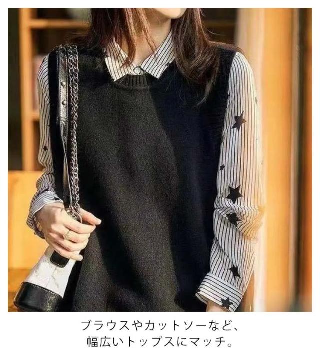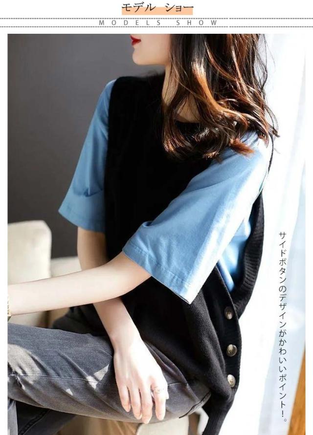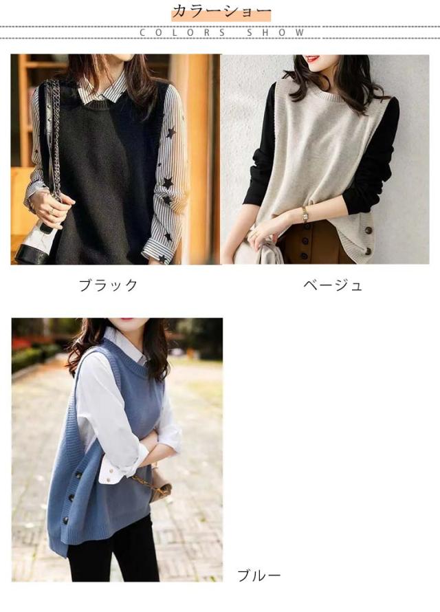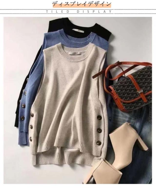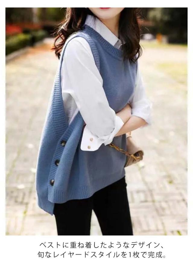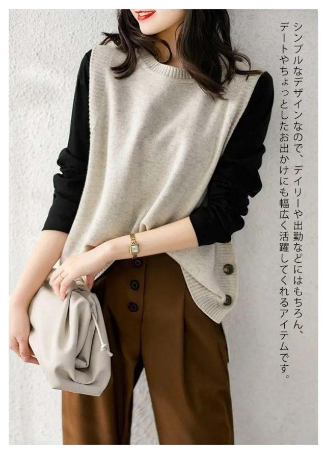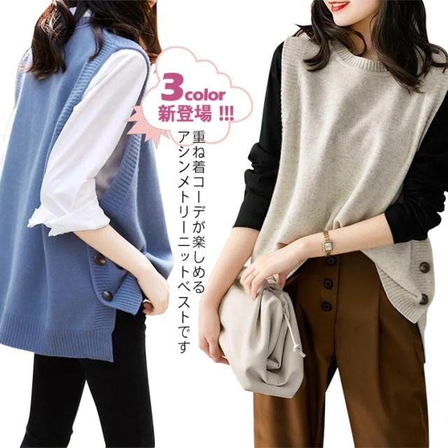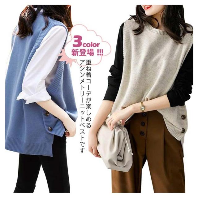 アシンメトリー ニットベスト ベスト アシンメトリー トップス プルオーバー ニット ラウンドネック シンプル 重ね着 スリット入りサイドボタン セーター ノースリーブ レイヤード 着回し シンプル きれいめ レディース