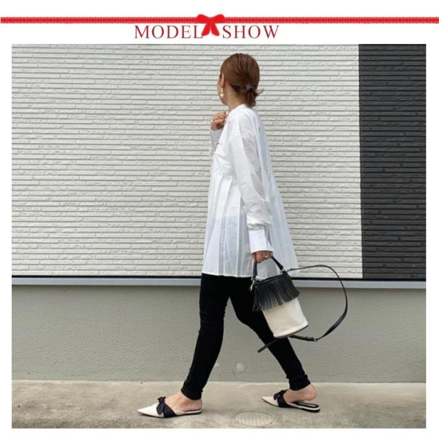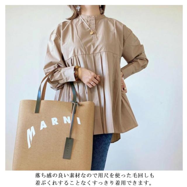 | ウエスト上から裾にかけて総プリーツ切替のチュニック丈シャツです。 すっきり見えのノーカラーデザインに、クラシカルな比翼ボタンのディテールが上品な大人の女性を演出してくれます。 ふんわりしたボリューム袖や立体的なプリーツが動くたびに揺れ女性らしいフェミニンな雰囲気◎ 落ち感の良い素材なので用尺を使った毛回しも着ぶくれすることなくすっきり着用できます。 ベストやビスチェもレイヤードしてもごわつかず、1枚でも様になるデザインになっています。 | |
