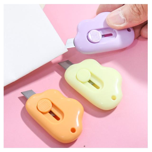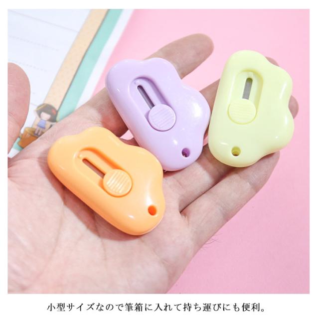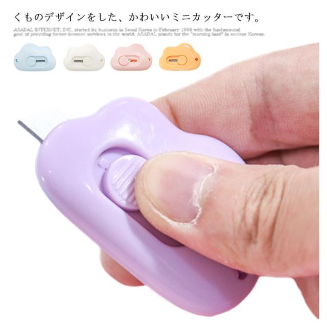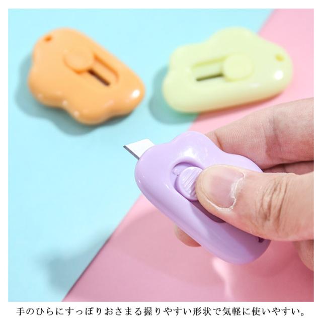 | くものデザインをした、かわいいミニカッターです。 ボタンをスライドさせると、カッターの刃が出てきます。 刃が短いので、書類や段ボールの中身を傷つけずに開封することができます。 手のひらにすっぽりおさまる握りやすい形状で気軽に使いやすい。 小型サイズなので筆箱に入れて持ち運びにも便利。 | |
