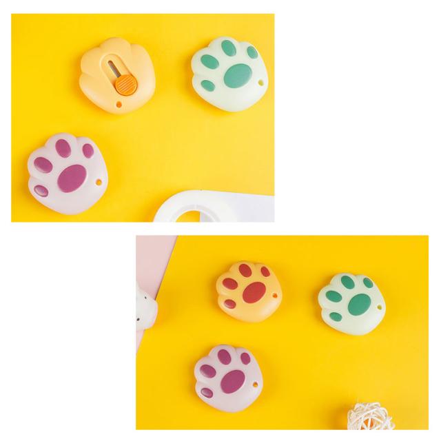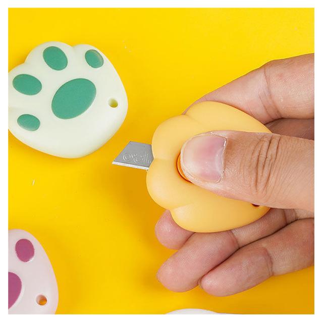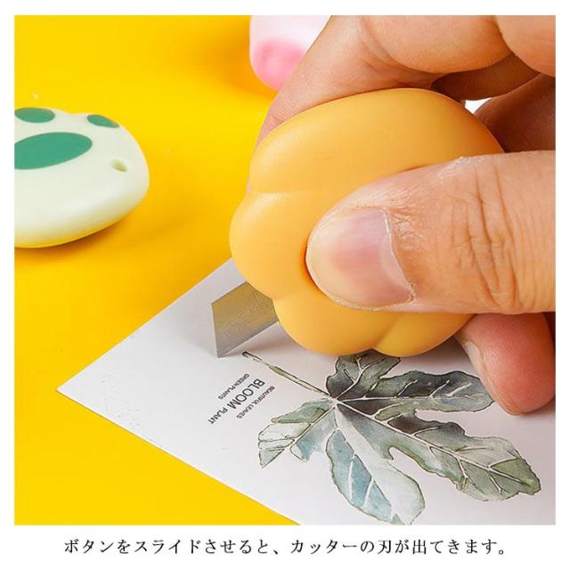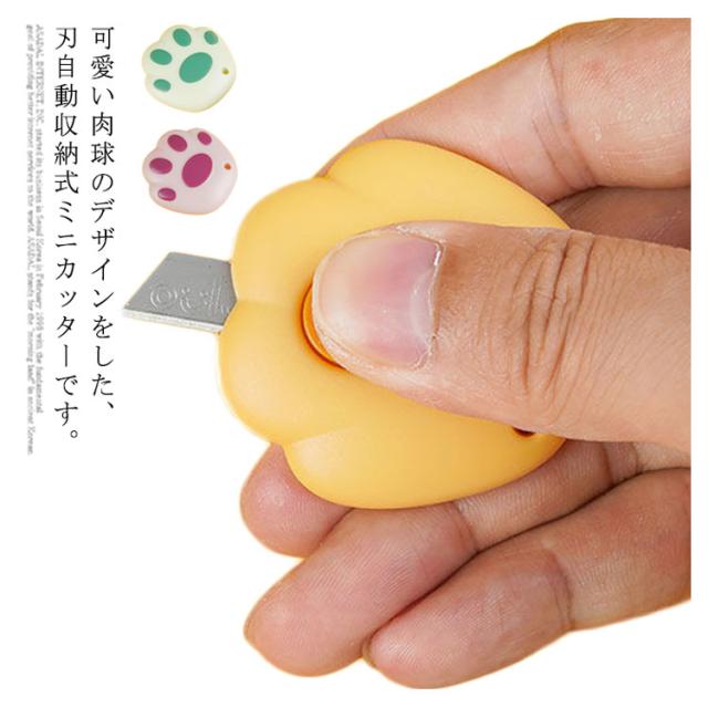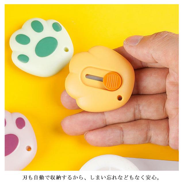 | 可愛い肉球のデザインをした、刃自動収納式ミニカッターです。 ボタンをスライドさせると、カッターの刃が出てきます。 刃も自動で収納するから、しまい忘れなどもなく安心。 手のひらにすっぽりおさまる握りやすい形状で気軽に使いやすい。 小型サイズなので筆箱に入れて持ち運びにも便利。 | |