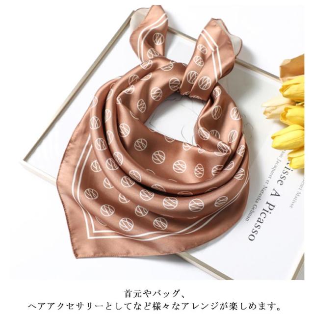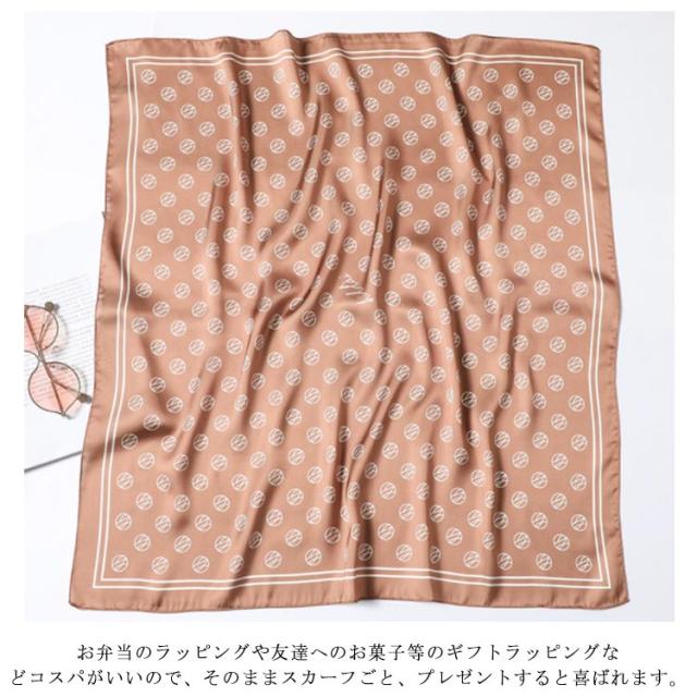 | デイリー使いしやすい大判サイズのスカーフ 光沢感のある柔らかな生地で、高見えするスカーフ。 普段のコーデにプラスするだけで上品でこなれた印象に。 首元やバッグ、ヘアアクセサリーとしてなど様々なアレンジが楽しめます。 お弁当のラッピングや友達へのお菓子等のギフトラッピングなどコスパがいいので、そのままスカーフごと、プレゼントすると喜ばれます。何かと使えるアイテムなのでおすすめです。 ◇コーディネート◇ シンプルコーデとの相性抜群な、巻くだけでこなれ感たっぷりなスタイルを演出できるアイテム。 ヘアアクセサリーやバッグアクセサリーとしてなど幅広いアイテムとのアレンジが楽しめます。 | |