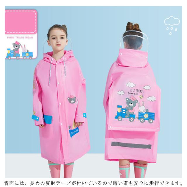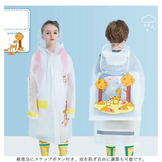 | 雨の日も気軽に通学できます!子供用レインコート フードは透明でダブル窓つきなのでしっかり防水防風の同時に視界も良好! 裾部分にスナップボタン付き、雨を防ぎ自由に調節も可能です。 背面には、長めの反射テープが付いているので暗い道も安全に歩行できます。 左右には防水のポケットがあり、手元の小物は気軽に出し入れます。 | |