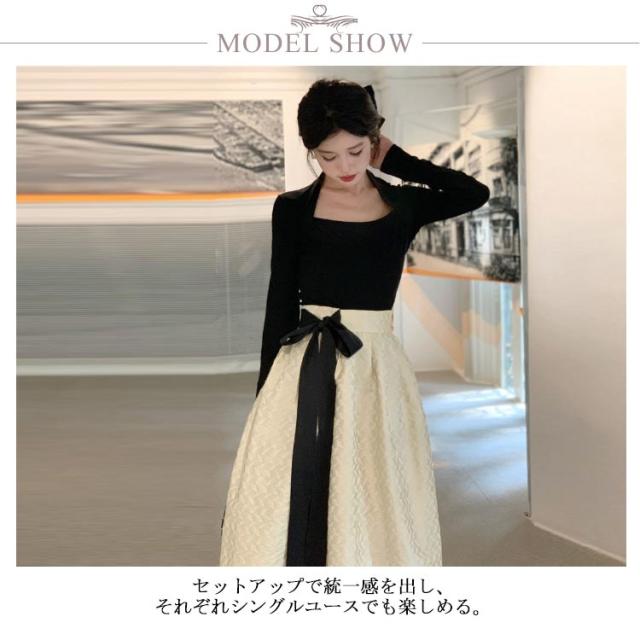 | 大人コーデが即完成するリボン付きスカートのセットが登場。 セットアップで統一感を出し、それぞれシングルユースでも楽しめる。 首元のスクエアネックのデザイン、デコルテラインを明るくキレイに魅せてくれます。 ウエスト部分は細っそりとスタイルアップ見えを叶えます。 Aラインは大人可愛いフェミニンな印象に仕上げてくれます。 | |