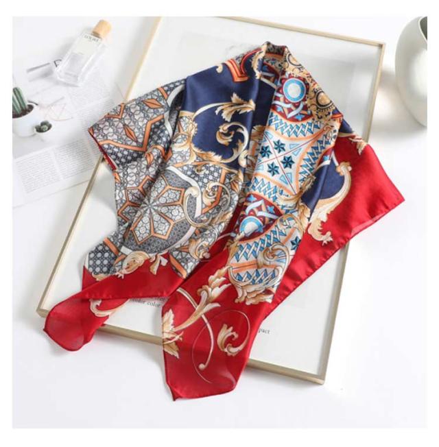 | 正方形の万能スカーフ。 辺約90cmの大判サイズなので、ストールやベルトがわりにしてみたり、バッグに結んだり、アレンジ自由自在でオシャレの幅が広がります。 ストール・ショールのようにも使えます。 シルクタッチのある滑らかな生地です。 | |